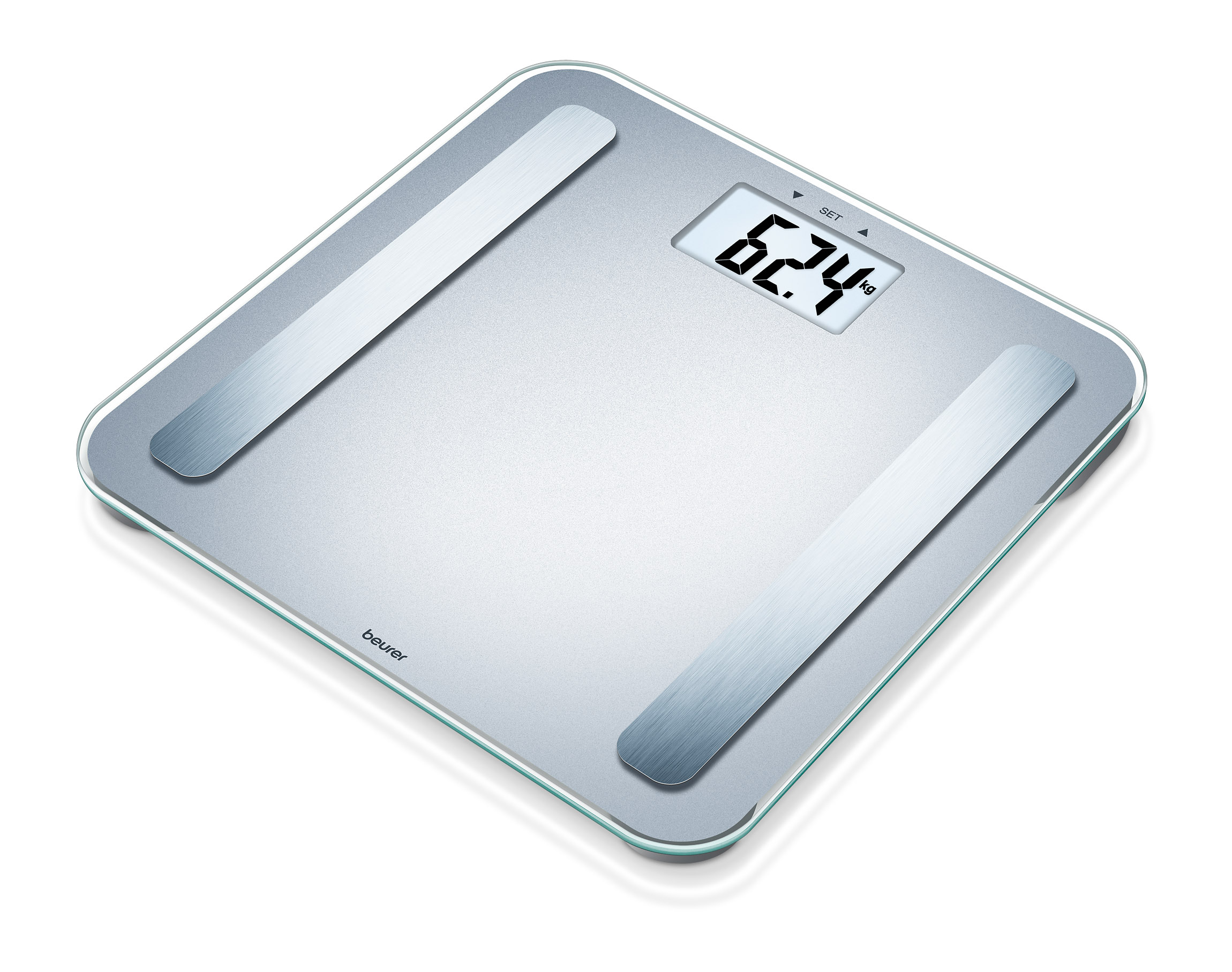 Turvalasilla ja XL-näytöllä varustettu vaaka mahdollistaa diagnostiikkatietojen, kuten viskeraalisen rasvan ja metabolisen iän mittauksen.
