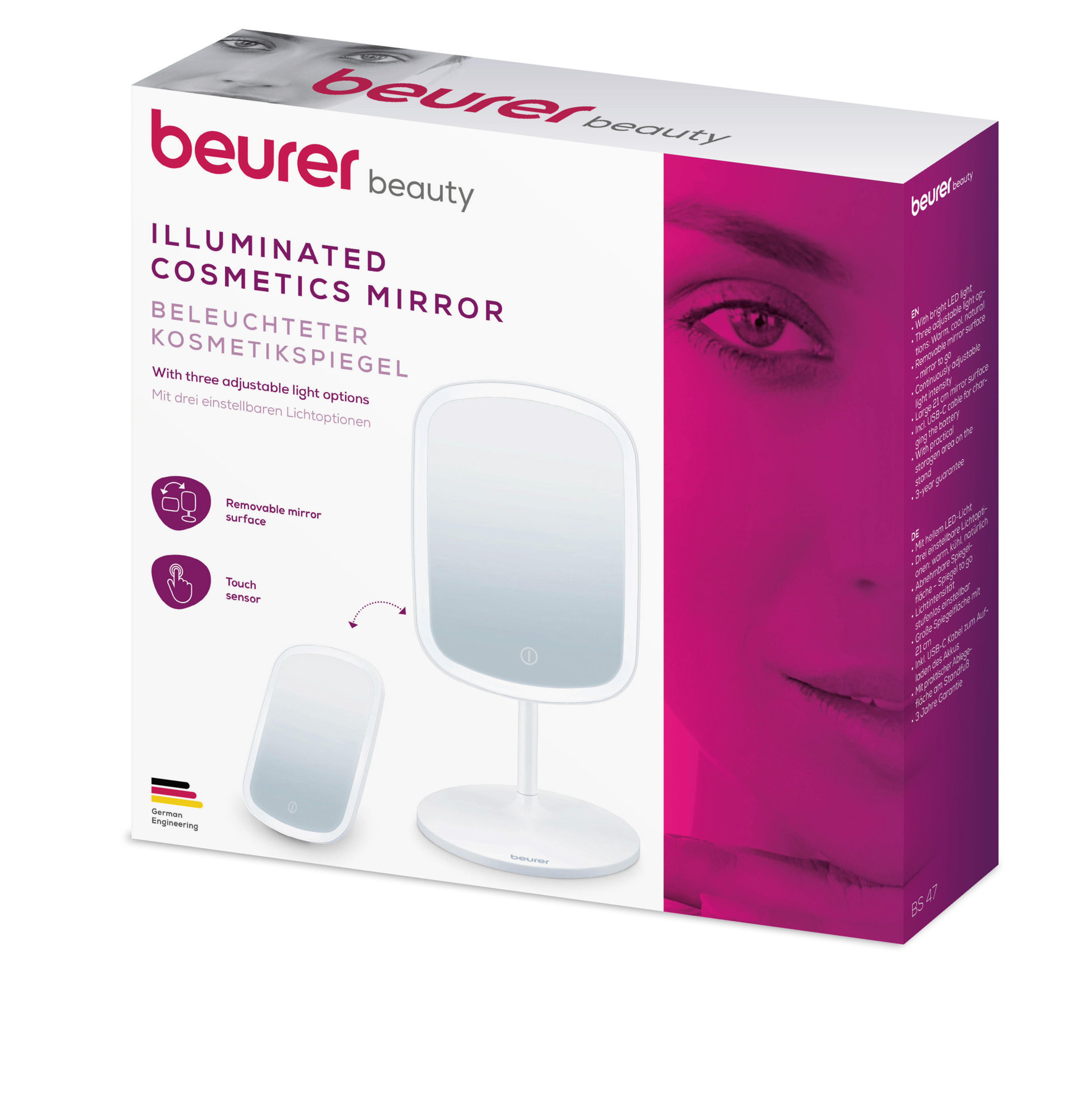Beurerin BS 47 -valaistu meikkipeili tarjoaa kolme eri valaistusvaihtoehtoa: lämmin, viileä ja luonnollinen valo, joten se sopii käytettäväksi kaikissa tilanteissa. Käytännöllisen magneettipidikkeen ansiosta peilin asentoa on helppo muuttaa tai peili irrottaa käytettäväksi käsipeilinä. Peilin pinnassa oleva integroitu kosketusanturi takaa myös helpon käytön.