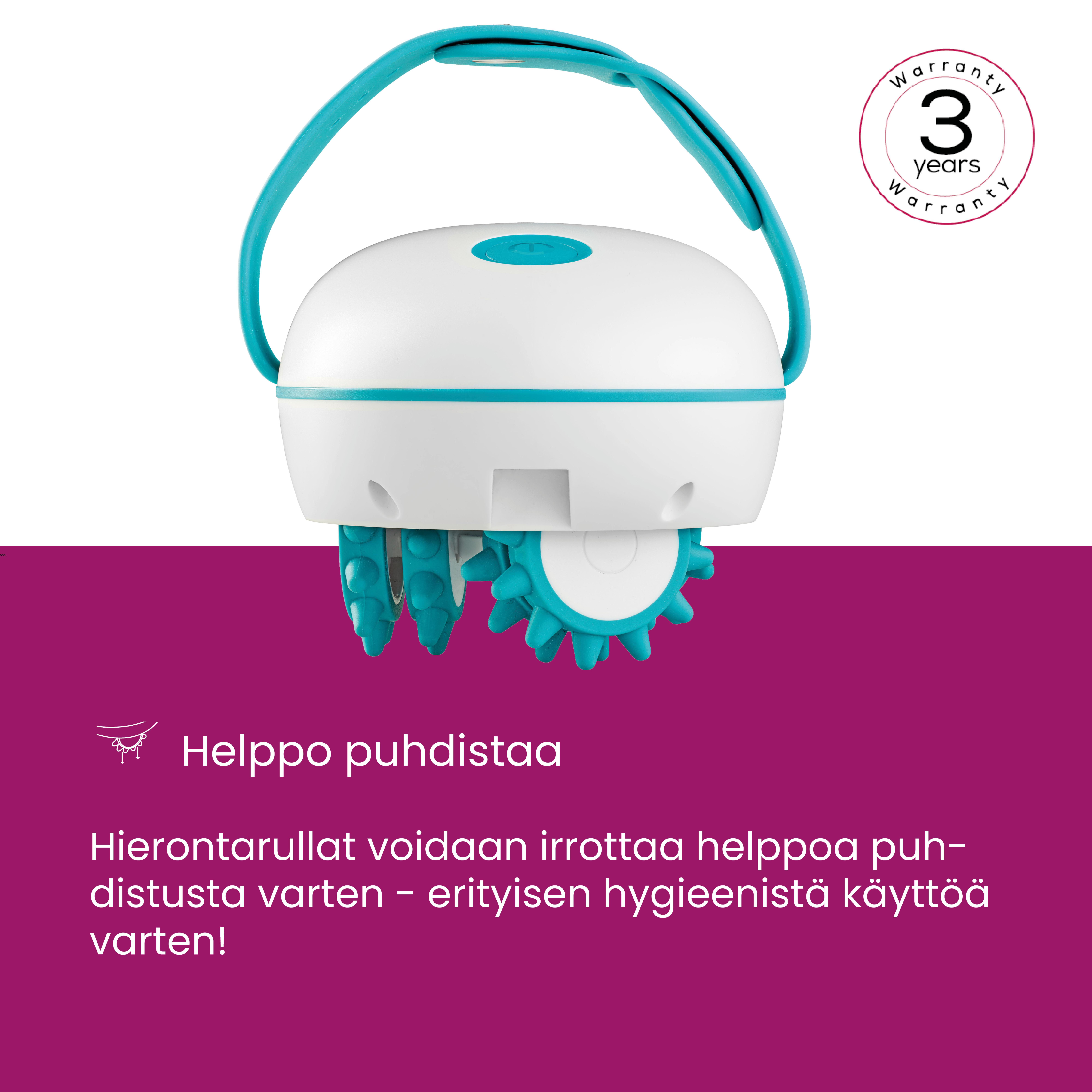 - Irrotettavat hierontarullat helpottavat puhdistusta