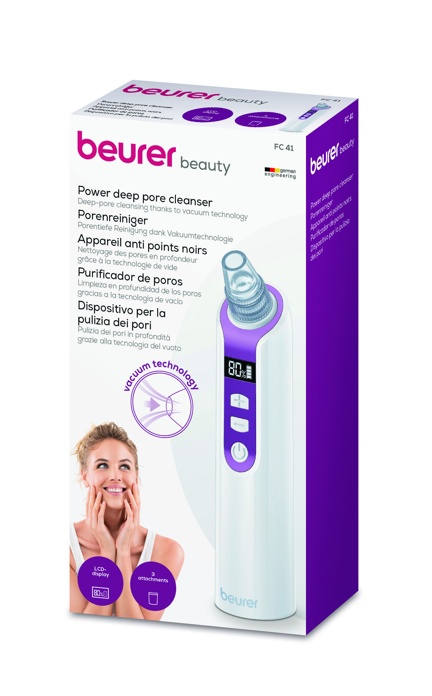 FC 41 mustapäidenpoistaja käyttää tyhjiöteknologiaa syvähuokospuhdistukseen ja jättää kasvojen ihon näyttämään terveeltä ja kauniilta. Se sopii kaikille ihotyypeille ja sen 3 eri suutinta tekee siitä monikäyttöisen laitteen.