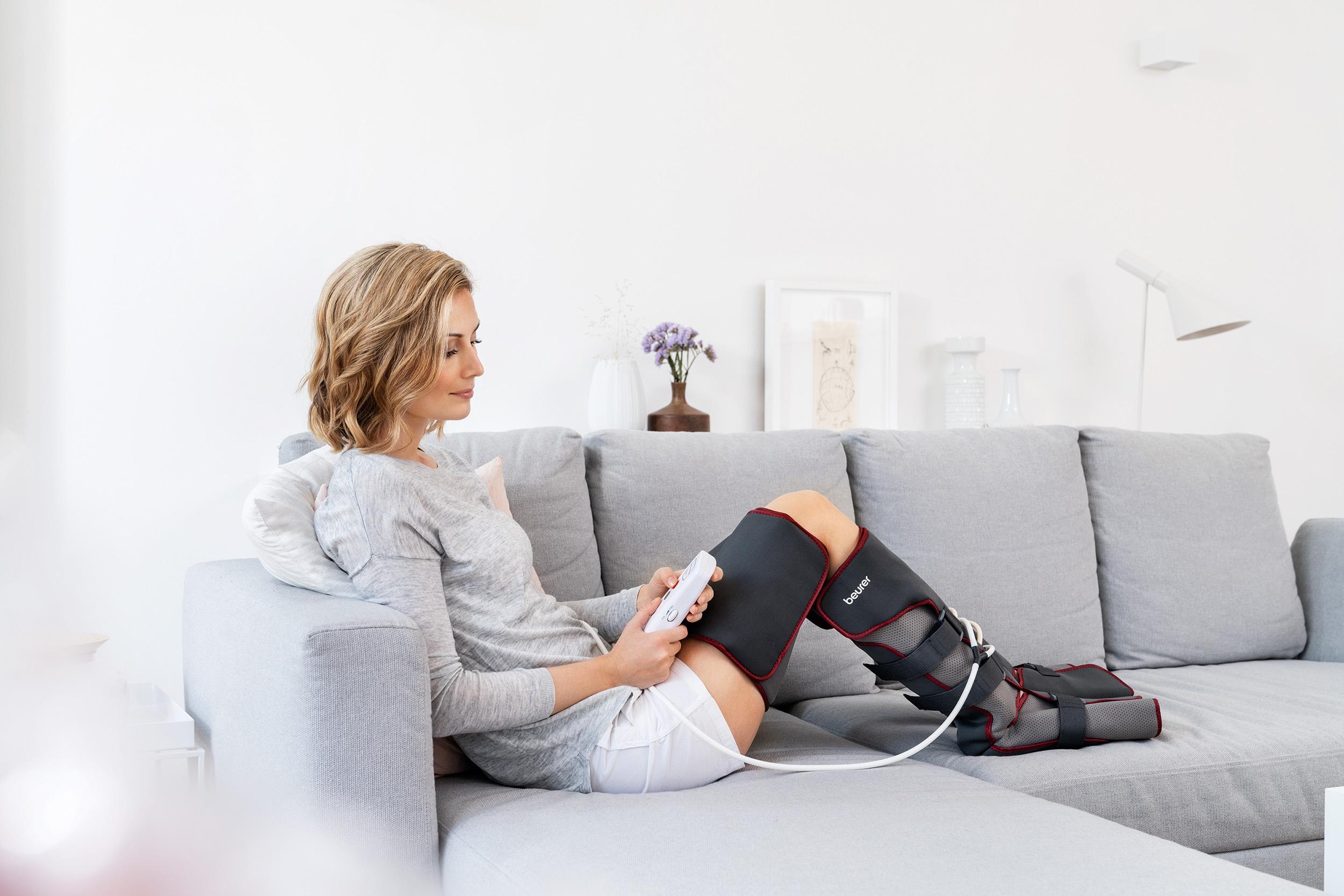 - Elvyttävä painehieronta suoritetaan neljällä mansetilla (kaksi jaloille ja kaksi reisille), joiden sisäänrakennetut ilmatyynyt supistuvat ja laajentuvat ja elvyttävät näin verenkiertoa