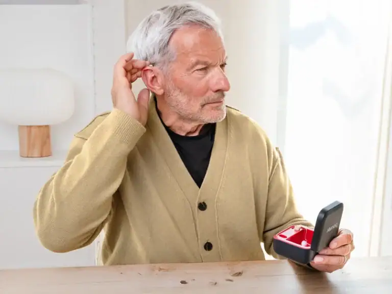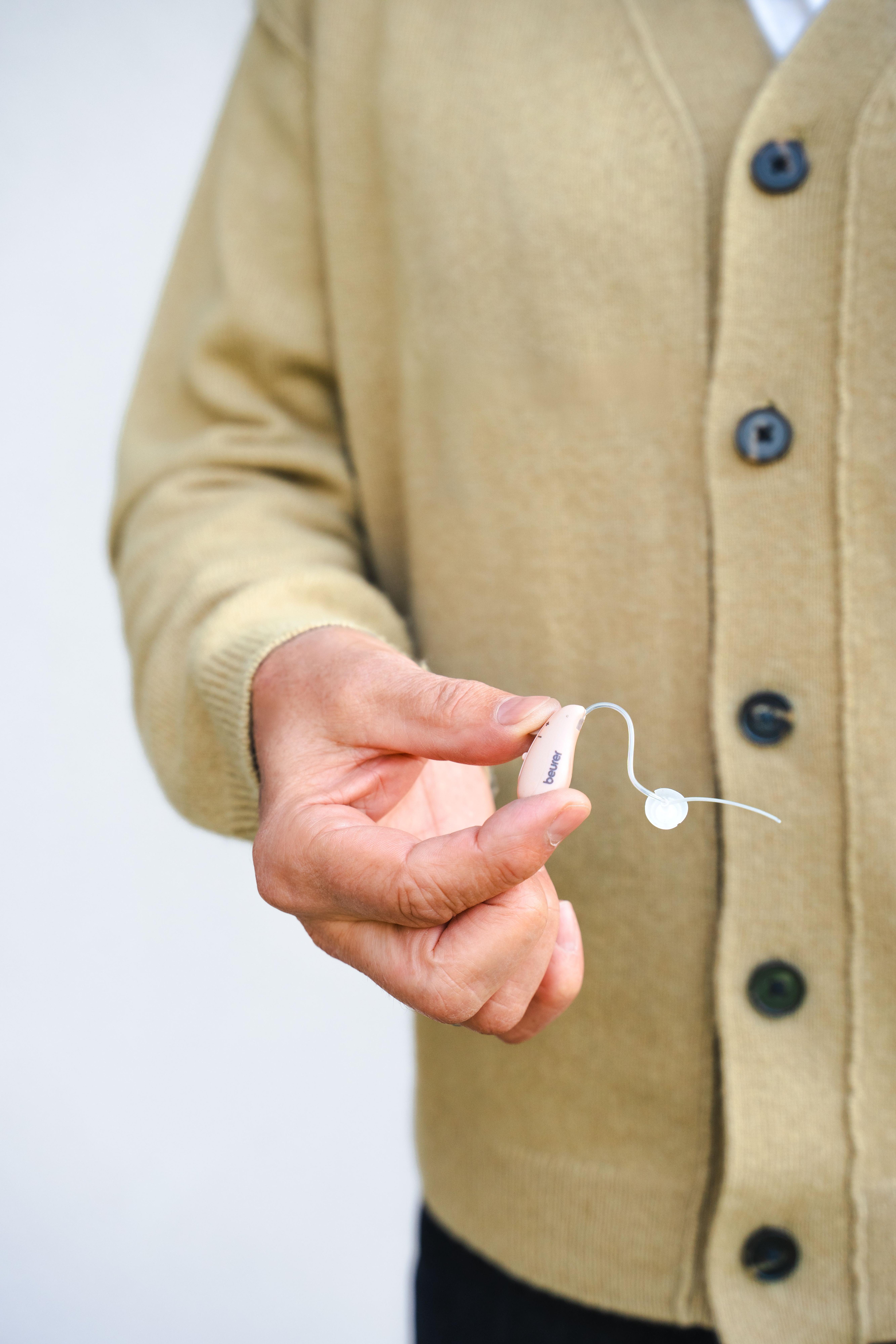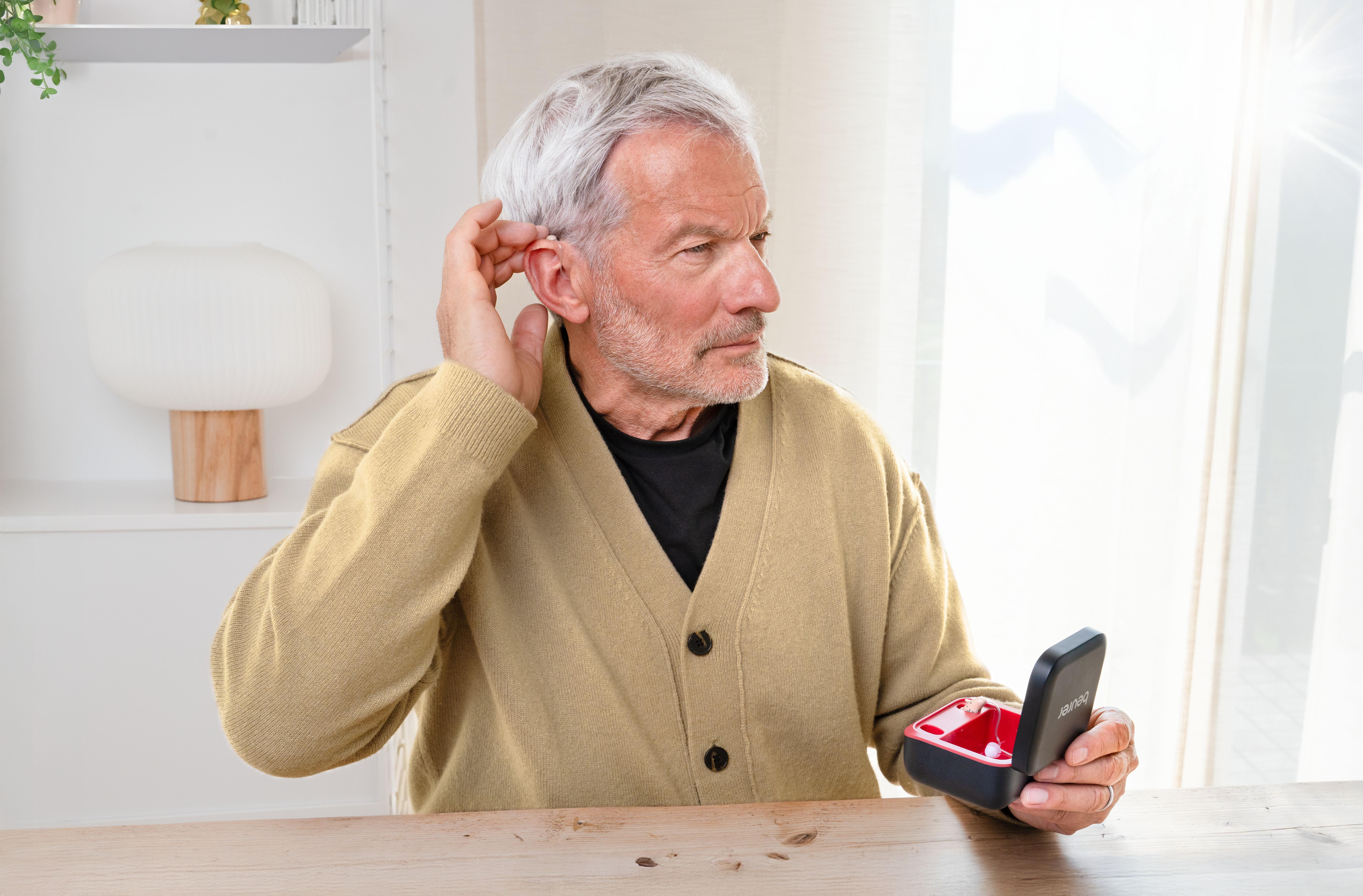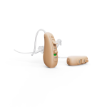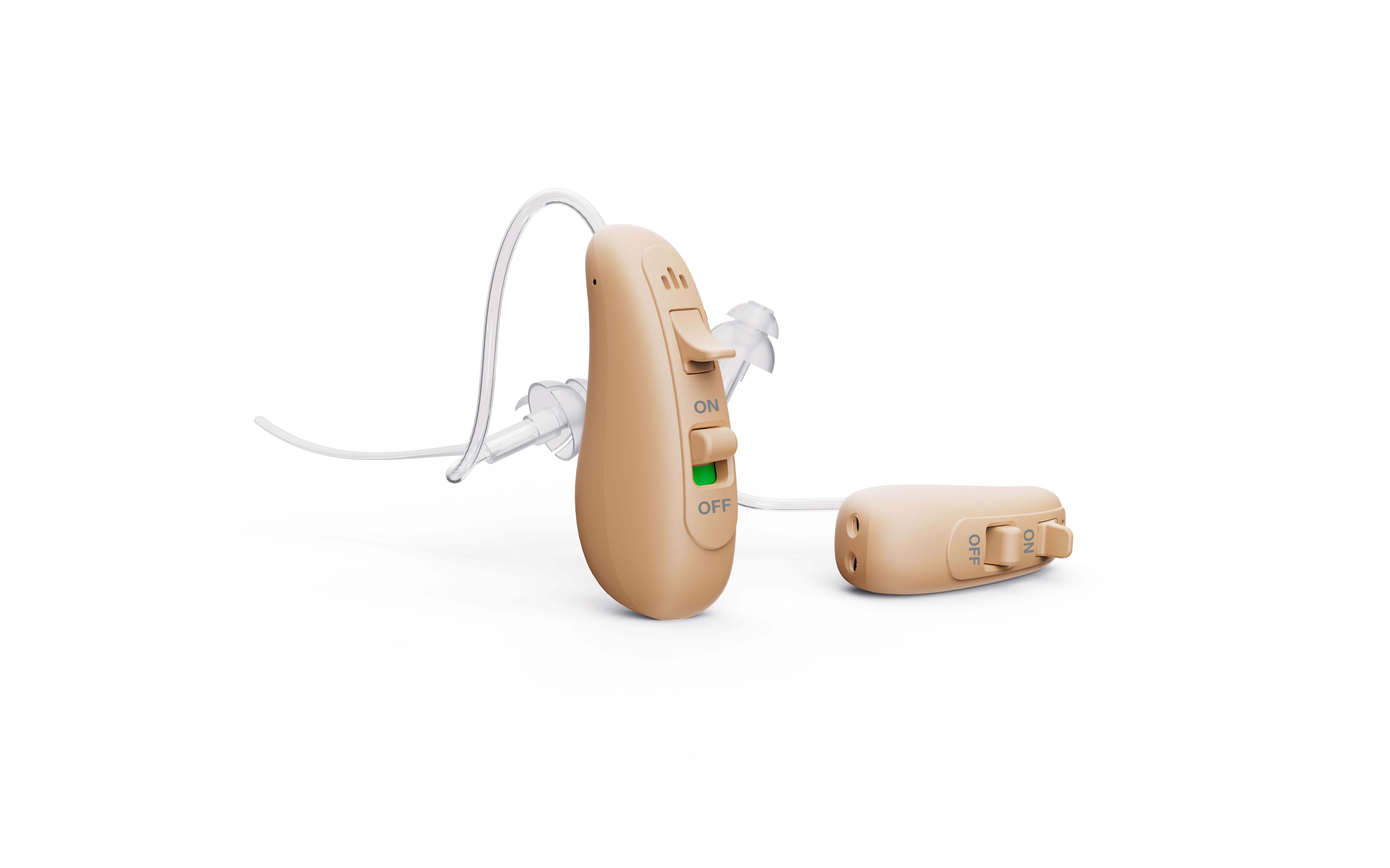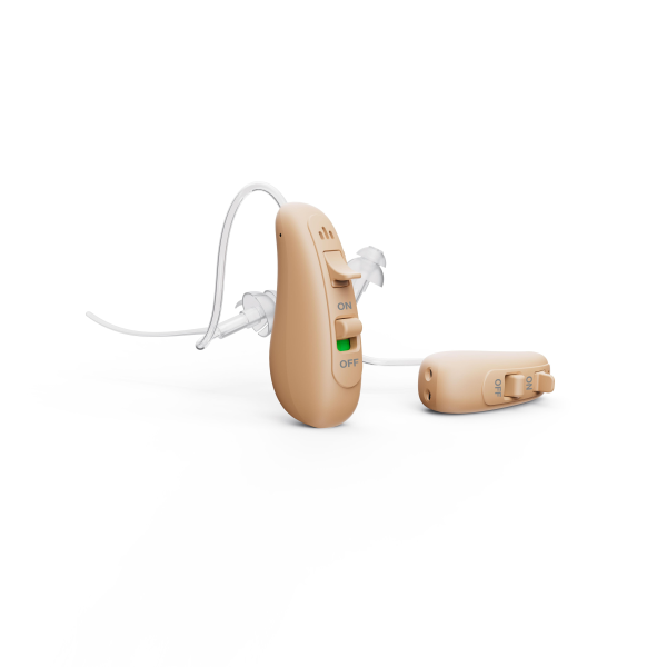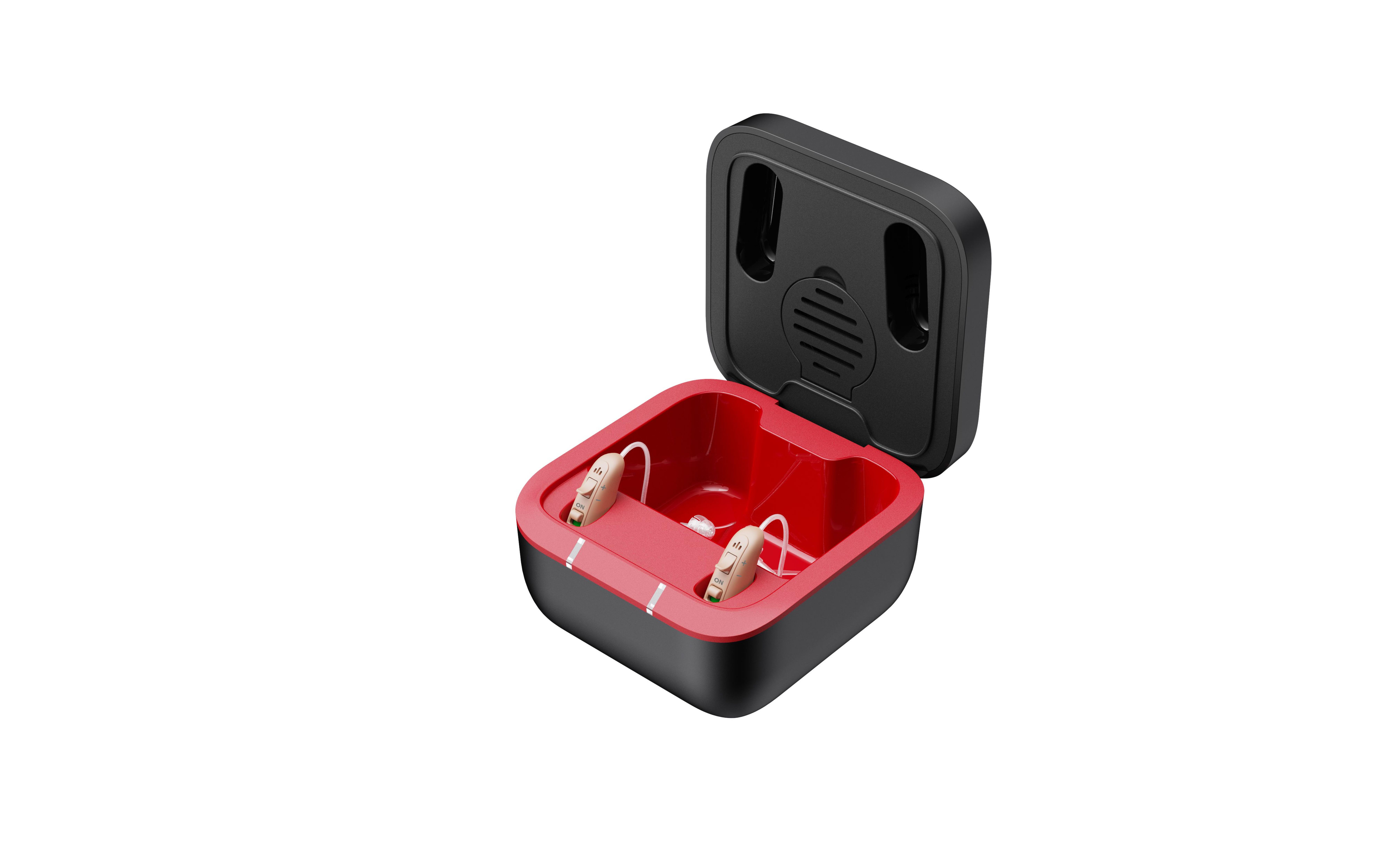 Ergonominen muotoilu istuu korvaan erinomaisesti ja pysyy tukevasti paikoillaan, tarjoten miellyttävän käyttökokemuksen myös pidempään käytettynä. Ohut ja huomaamaton rakenne tekee kuulokojeesta lähes näkymättömän korvan takana.