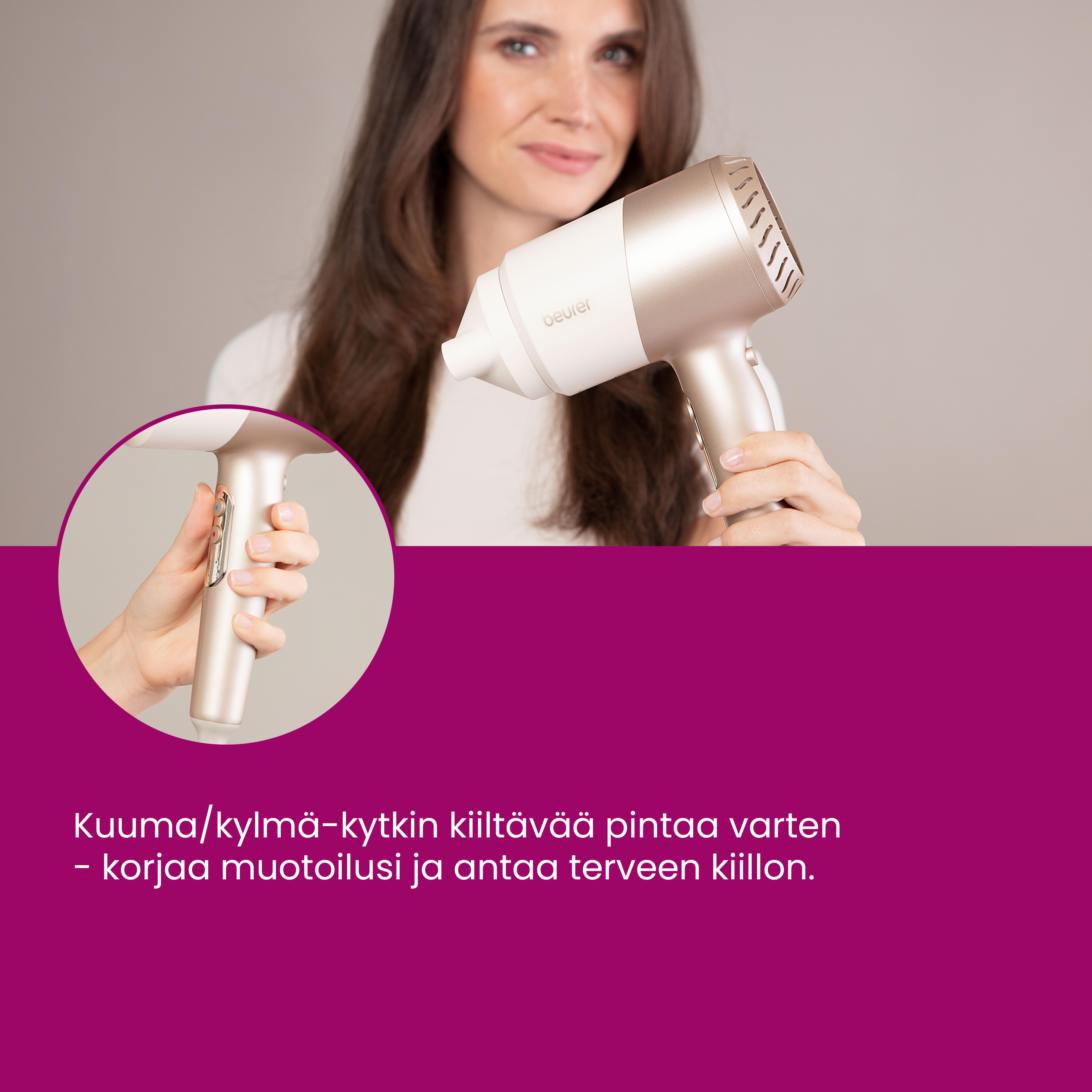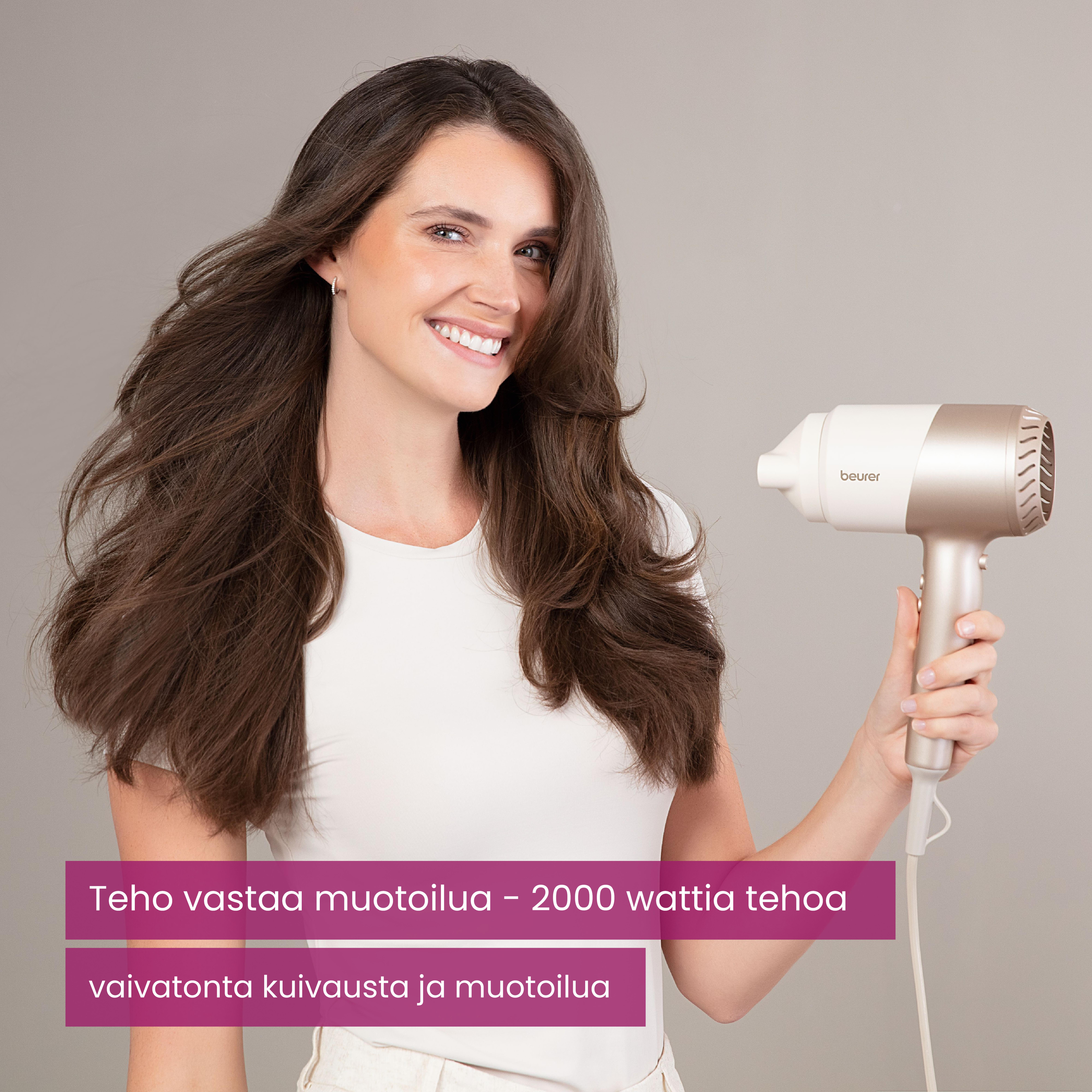 - 3 joustavaa lämpötila-asetusta ja 3 tehoasetusta hellävaraiseen kuivaukseen
