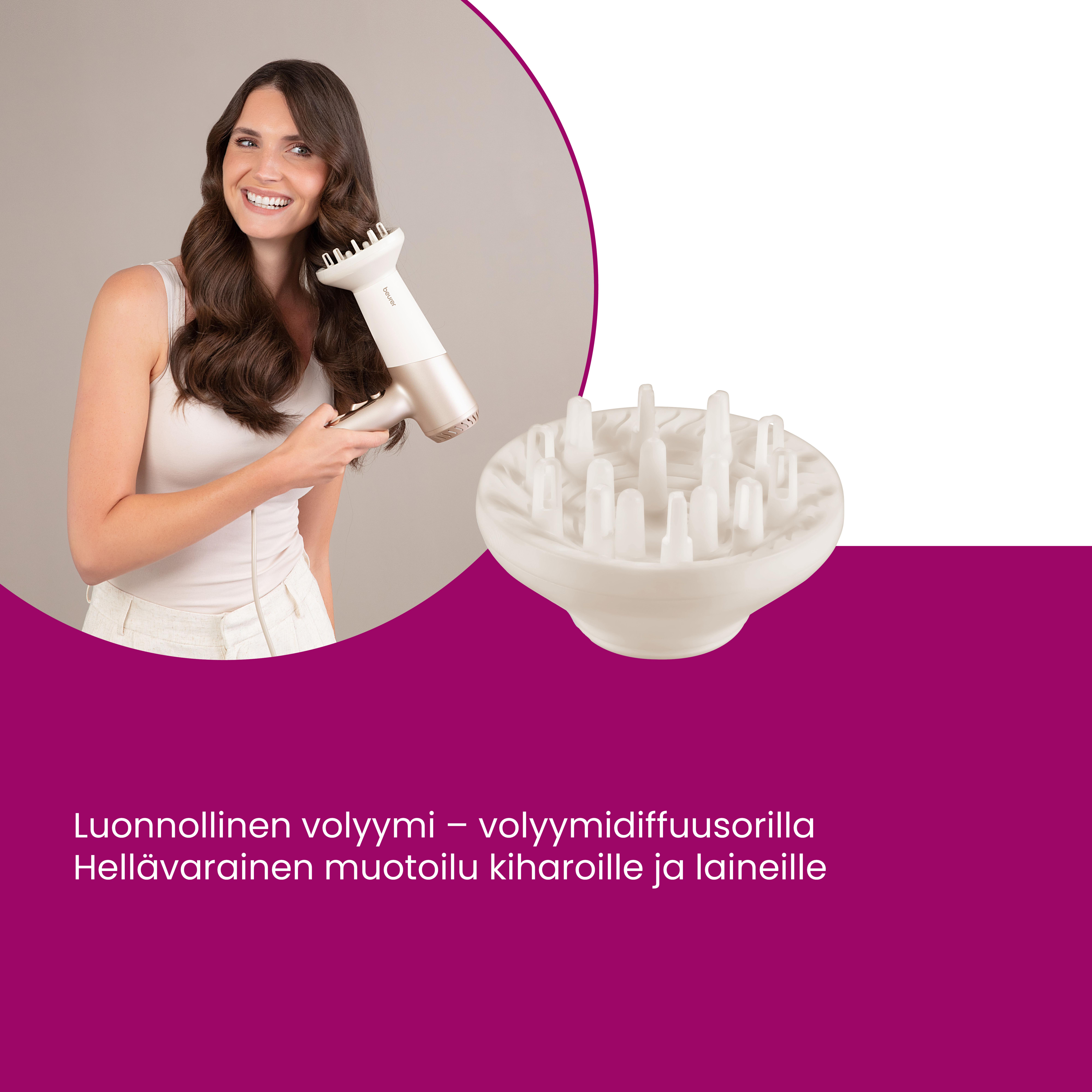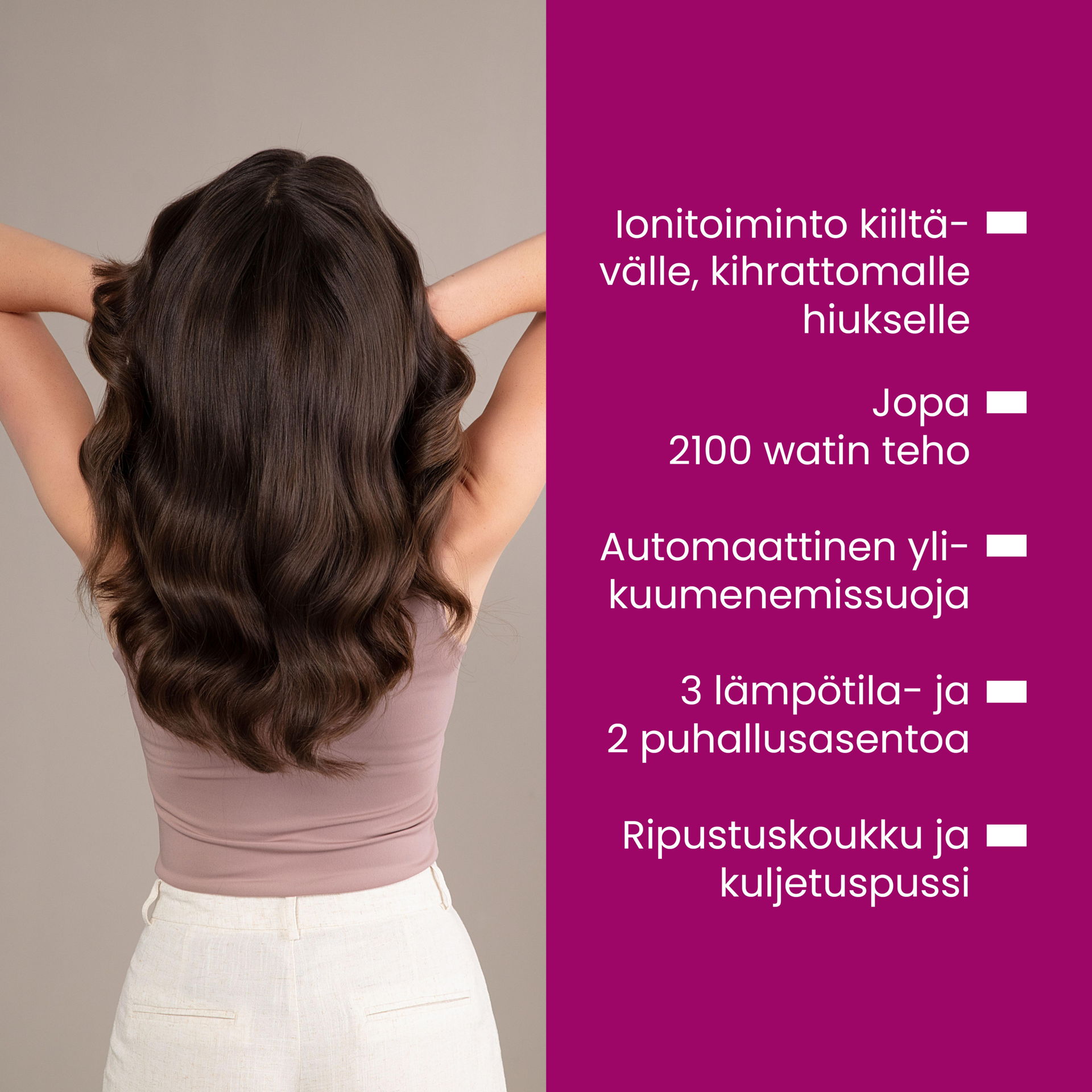 - Pehmeät ja kiiltävät hiukset integroidun ionitoiminnon ansiosta