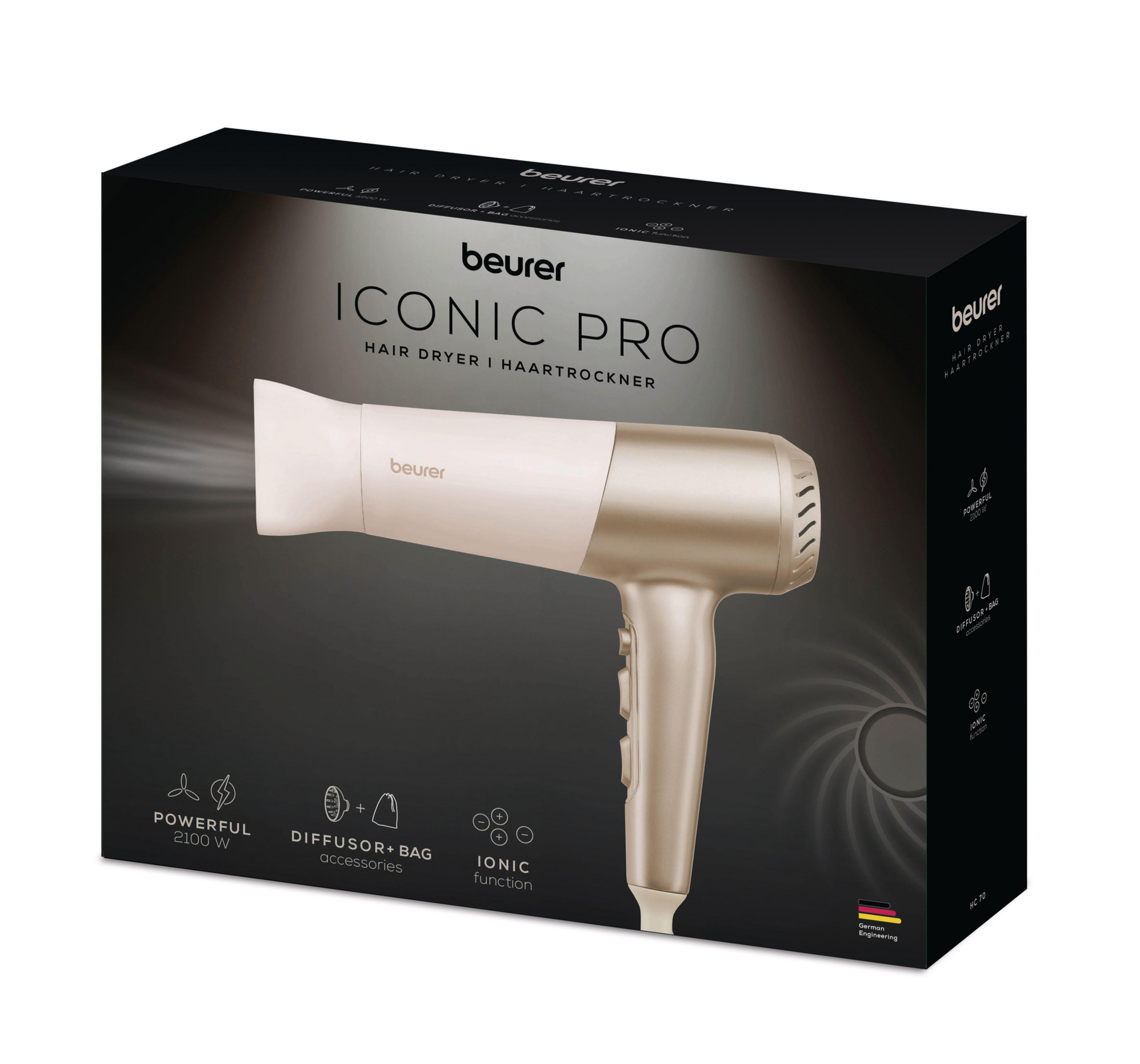 Beurer HC 70 on kevyt, ergonominen ja siinä on integroitu ionitoiminto kiiltävään hiuksiin. Tehokas DC-moottori takaa nopean kuivauksen, ja lukittava kylmäilmatoiminto kiinnittää kampauksen. Automaattinen sammutustoiminto suojaa ylikuumenemiselta ja irrotettava turvasuodatin helpottaa puhdistusta. Ripustuskoukku helpottaa säilytystä.