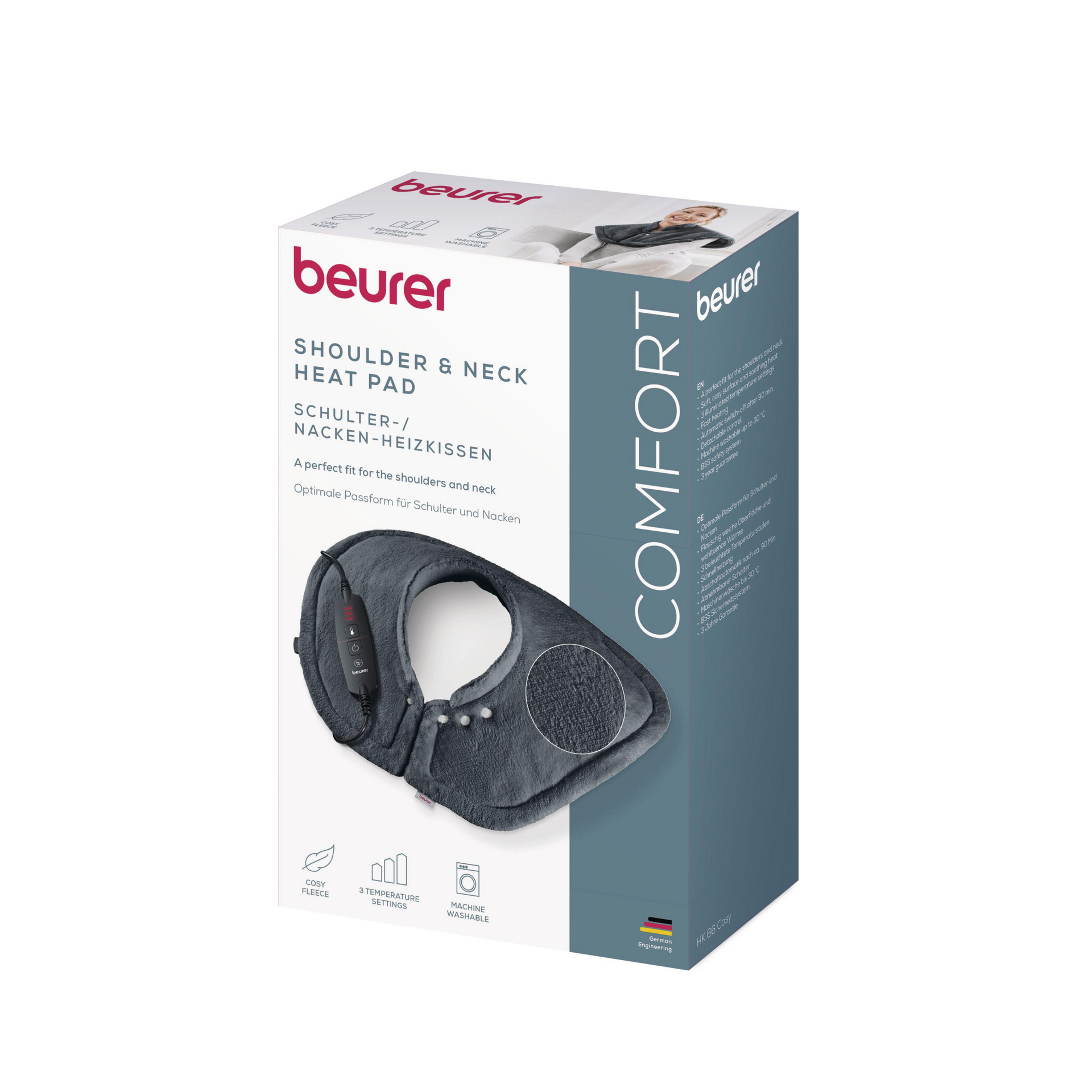 Beurer HK 66 niska- ja hartijalämmitin on valmistettu pehmeästä materiaalista, joka on erityisen hengittävä ja ihoystävällinen. Lämmön voi säätää yksilöllisten tarpeiden mukaan kolmella lämpötila-asetuksella. Hygieenisen käytön takaamiseksi lämmitin voidaan pestä pesukoneessa 30 °C:ssa.