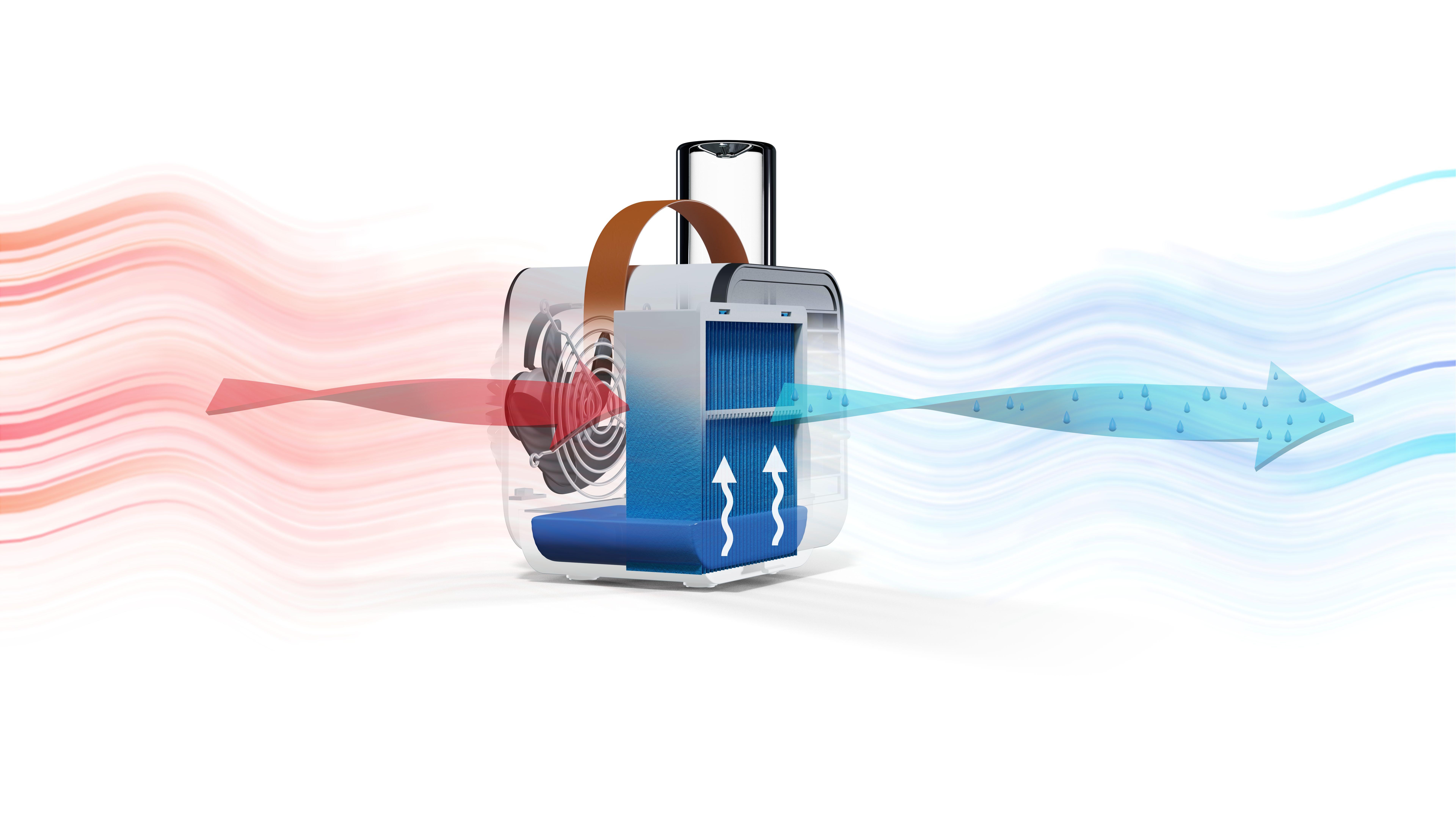 Pöytätuuletin imee kuivaa ja lämmintä huoneilmaa, joka virtaa vedellä kostutettuun haihdutussuodattimeen. Vesi haihtuu joutuessaan kosketukseen ilman ja kostean suodatinpinnan kanssa. Sisäilma ottaa kosteutta. Tällöin huoneilmasta poistetaan haihtumiseen vaadittava lämpöenergia.