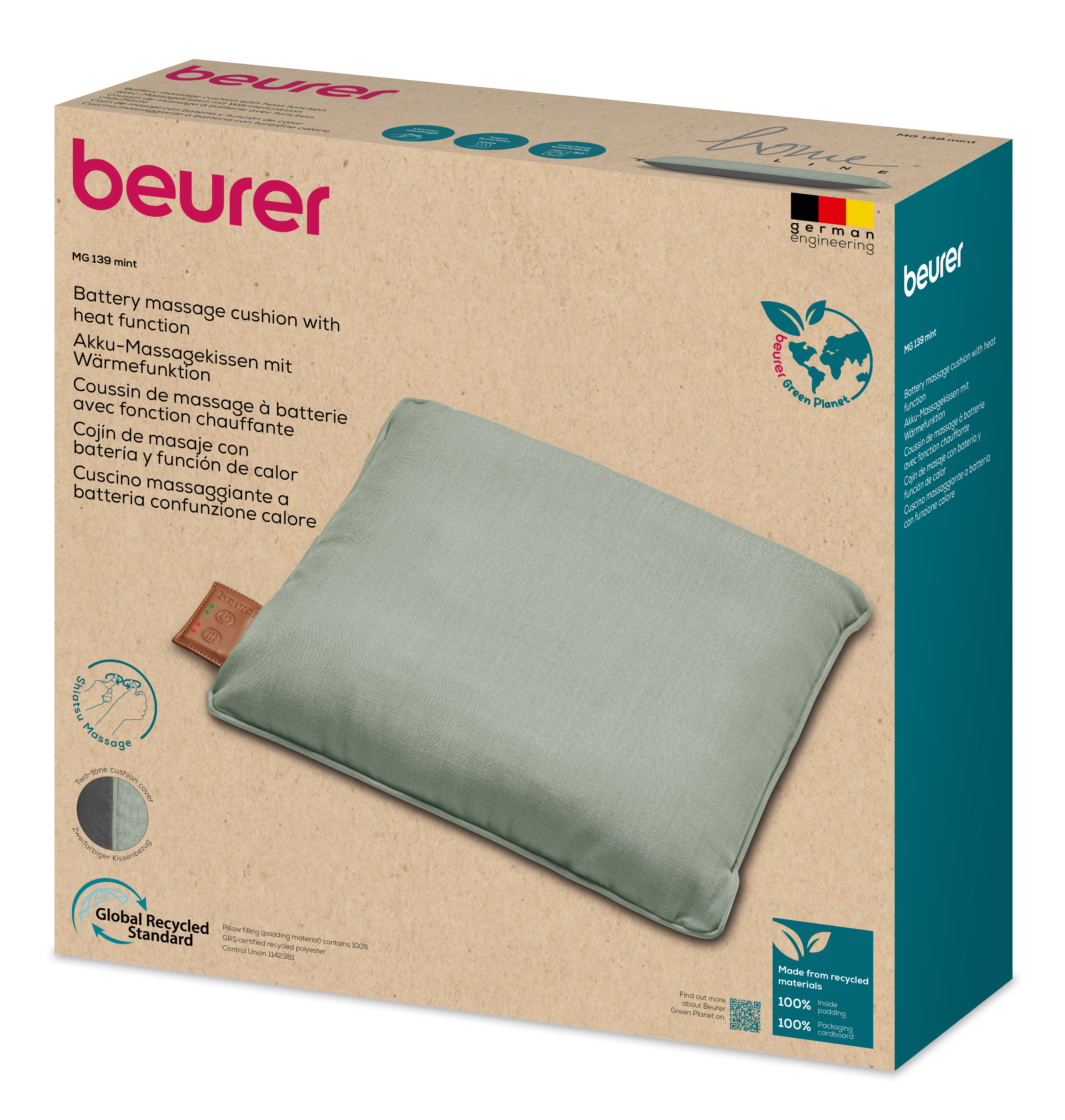 Koe puhdas rentoutuminen langattomalla Beurer MG 139 akkukäyttöisellä hierontatyynyllä – Shiatsu-hieronta ja lämpötoiminto yhdistettynä tarjoavat täydellisen hyvinvointikokemuksen – olitpa sitten kotona, toimistossa tai matkalla.