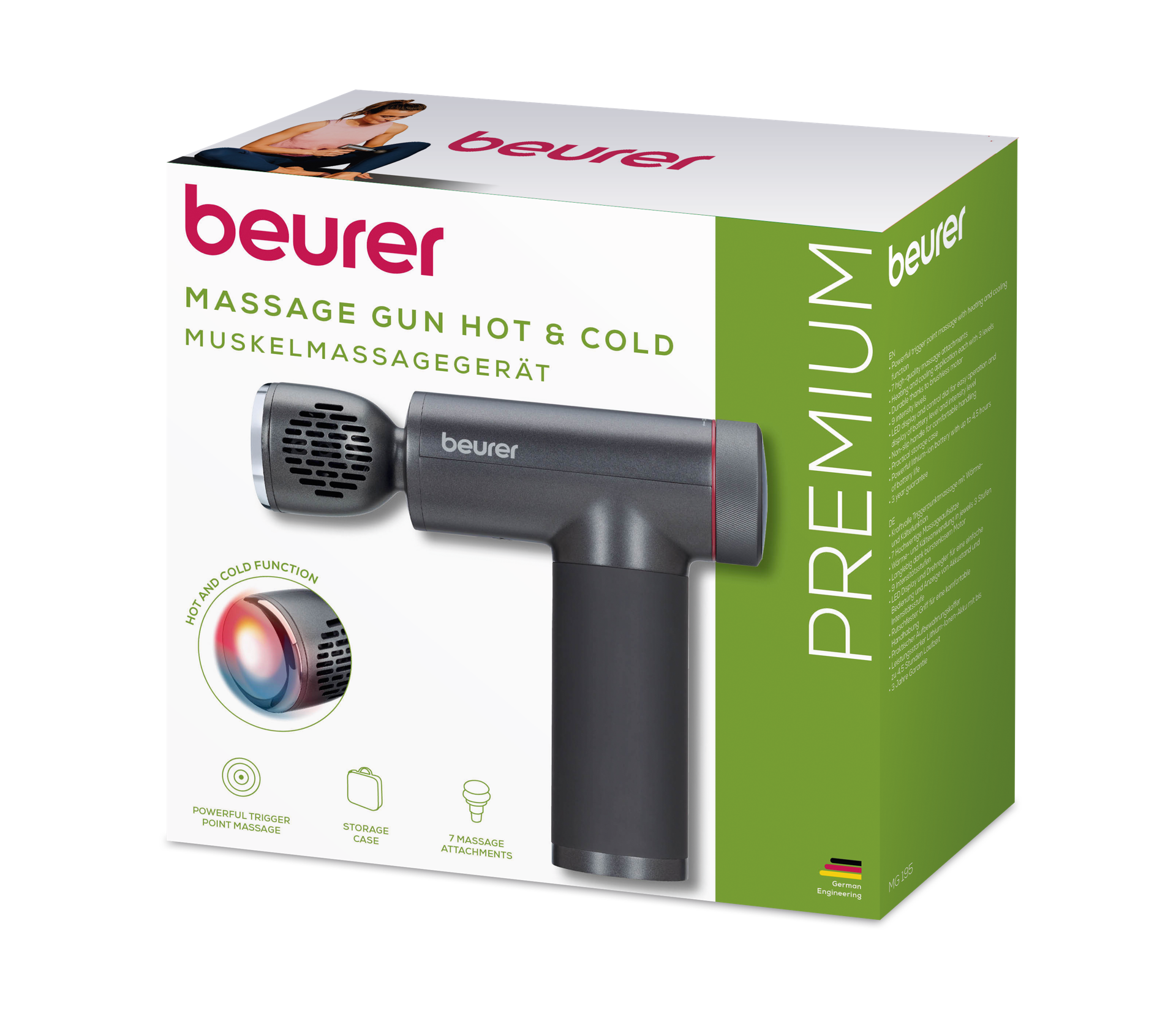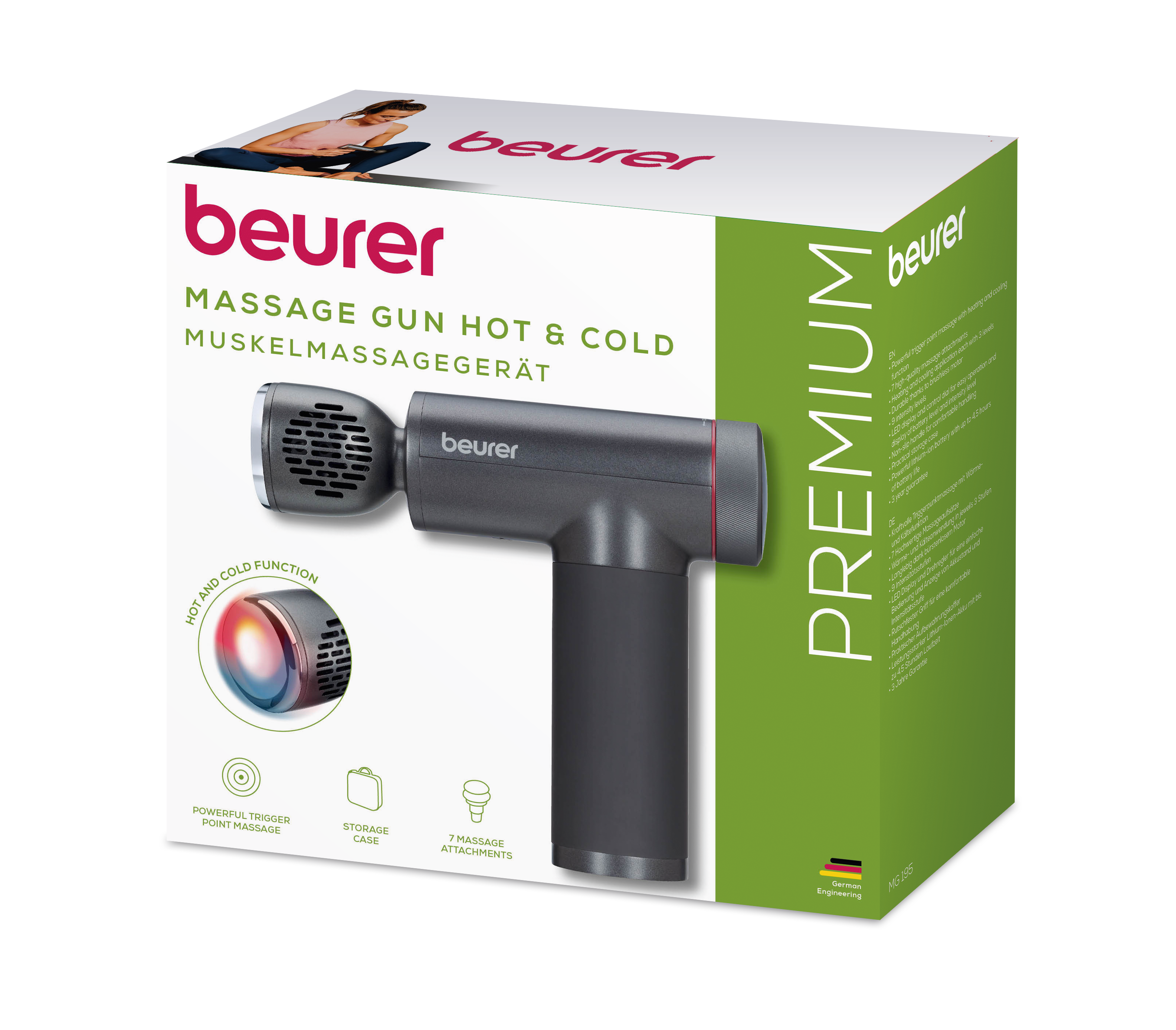 MG 195 Hot & Cold lihashuoltovasara – täydellinen ratkaisu tehokkaaseen trigger point hierontaan ja syvään rentoutumiseen. Innovatiivisen kuuma- ja viilennystoiminnon ja 7 korkealaatuisen hierontapään ansiosta tämä hierontapistooli mukautuu yksilöllisiin tarpeisiisi. Voit valita 9 tehotason välillä lempeää rentoutumista tai intensiivistä syvähierontaa varten. Ergonominen muotoilu ja liukumaton kahva takaavat miellyttävän käsittelyn, ja käytännöllisen säilytyskotelon ansiosta sitä on helppo käyttää kotona tai matkoilla.