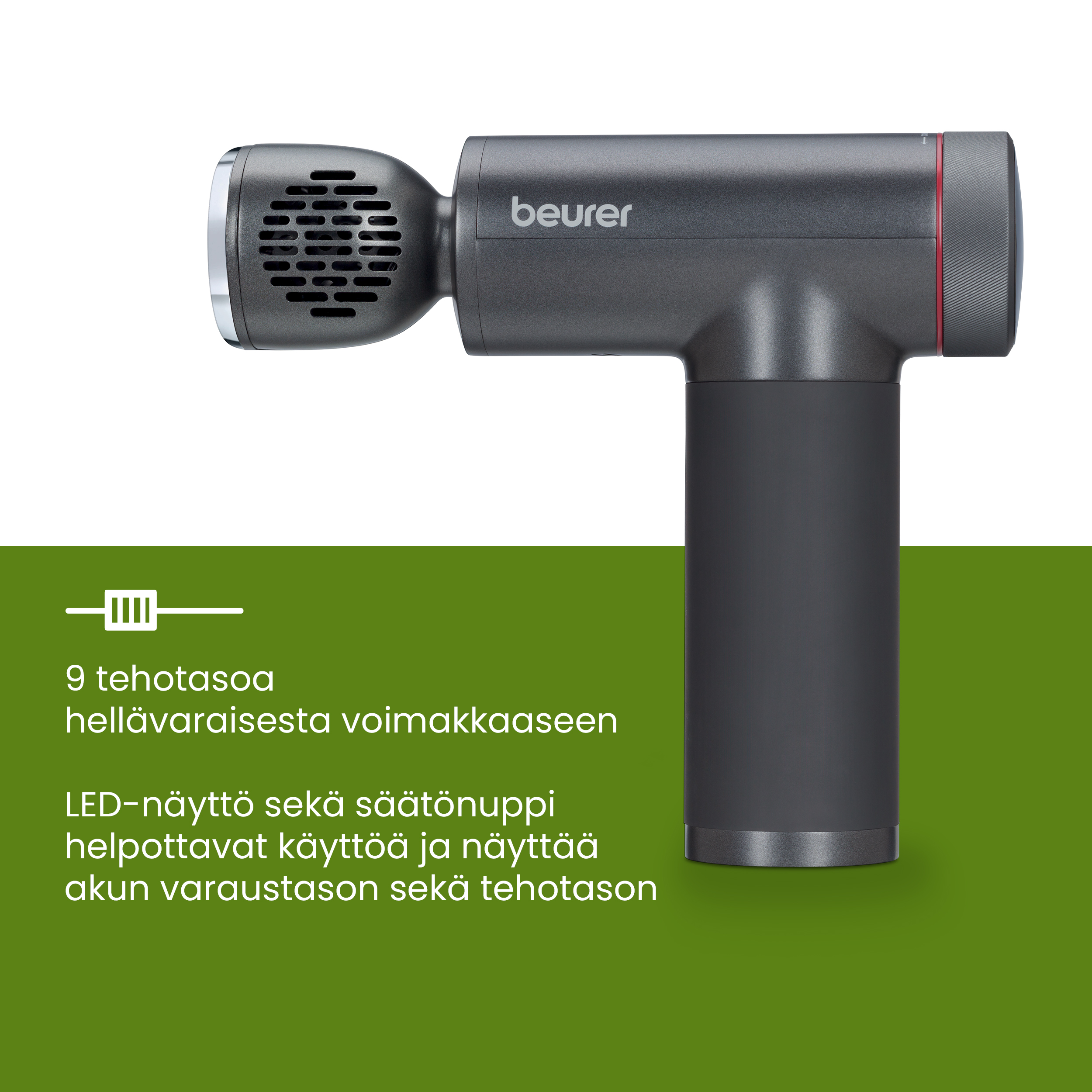 - LED-näyttö ja säätöpyörä helppokäyttöisyyttä sekä akun varaustason ja intensiteettitason näyttöä varten.