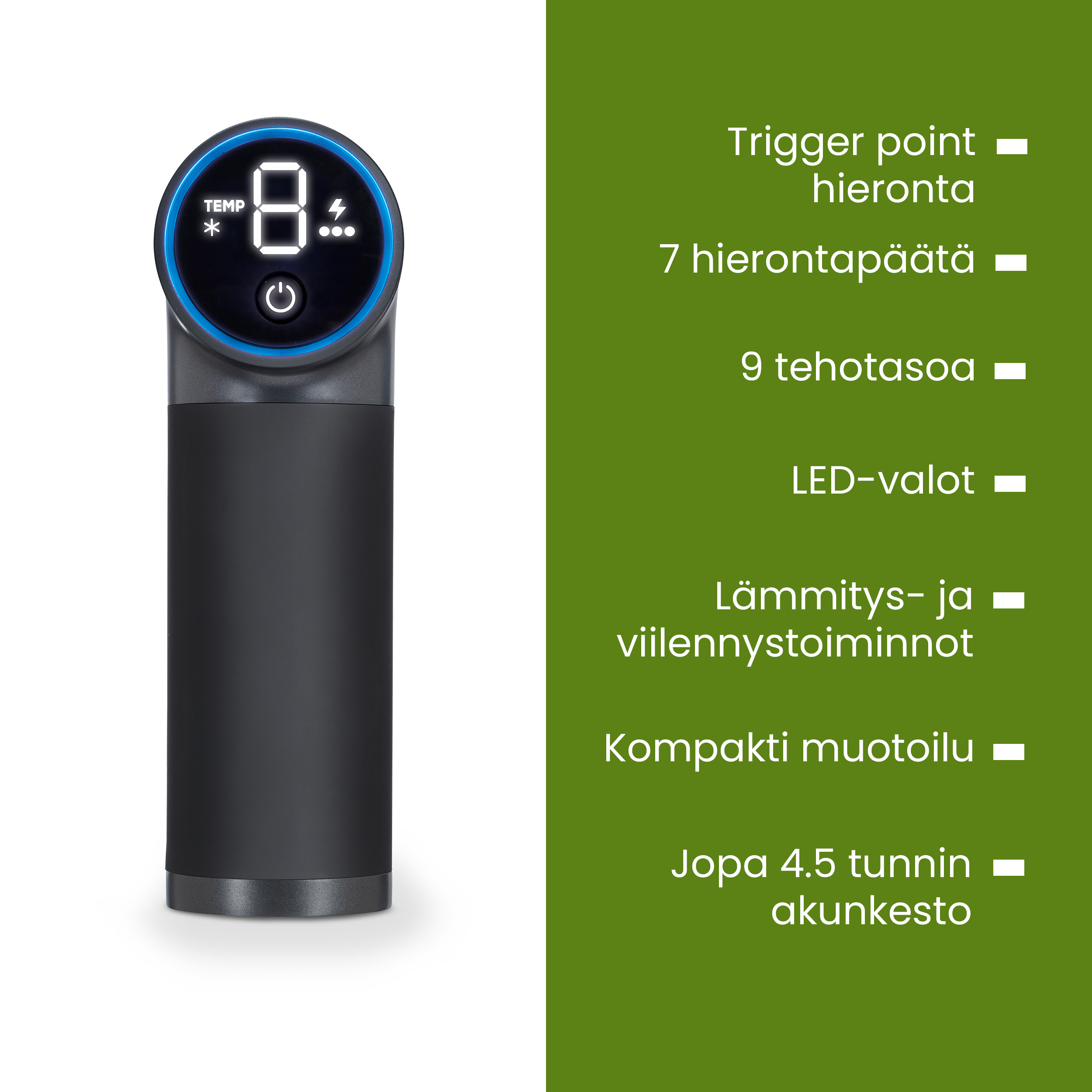 Tehokkaaseen trigger point hierontaan lämpö- ja kylmätoiminnolla.