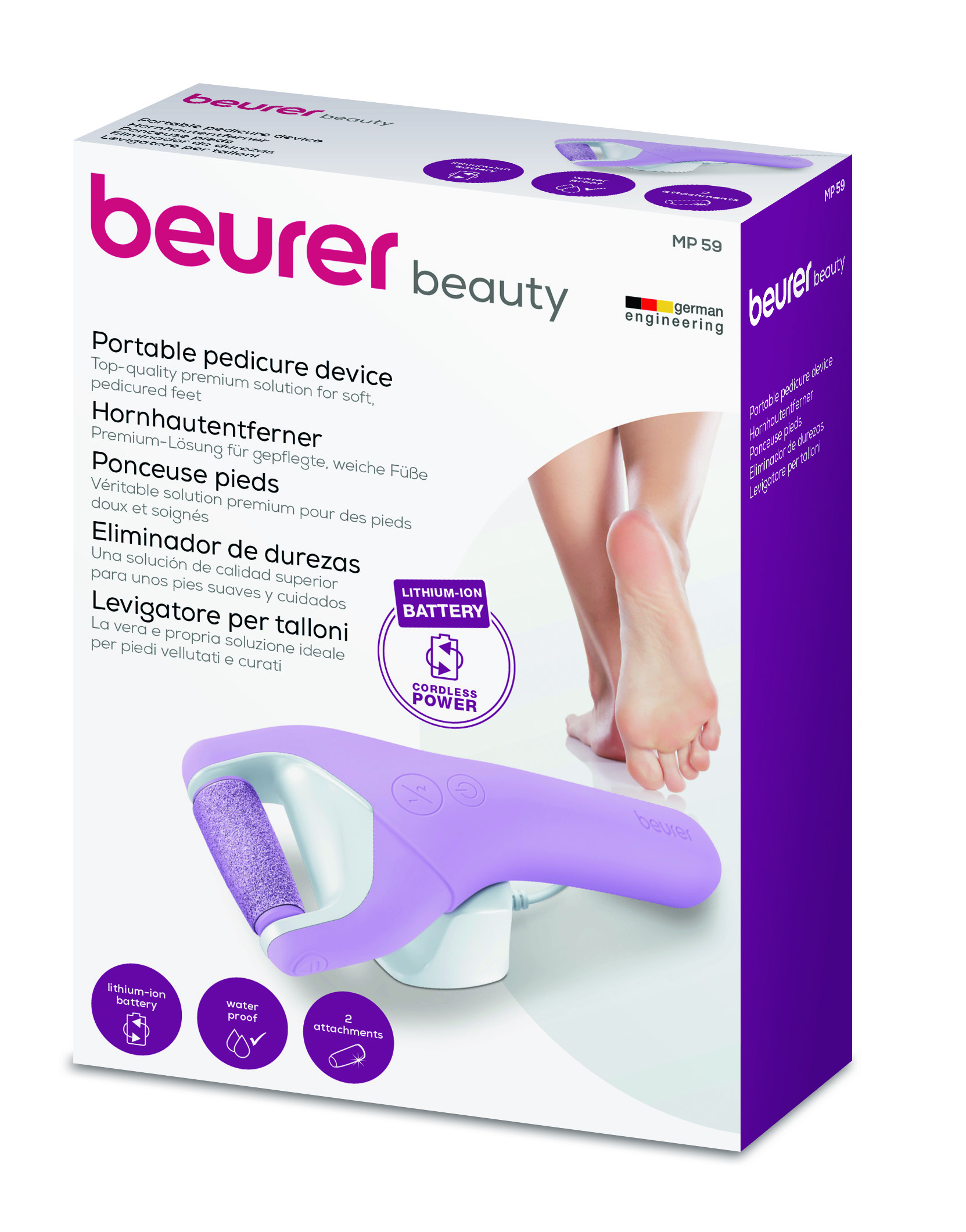 MP 59:n avulla voit helposti poistaa jalkojesi ei-toivotut kovettumat ja kovan tai karhean ihon. Laitetta voidaan käyttää märkänä ja kuivana. Kannettavassa jalkaraspissa on tehokas litiumioniakku, joka takaa erityisen pitkän ja tehokkaan akkukeston.