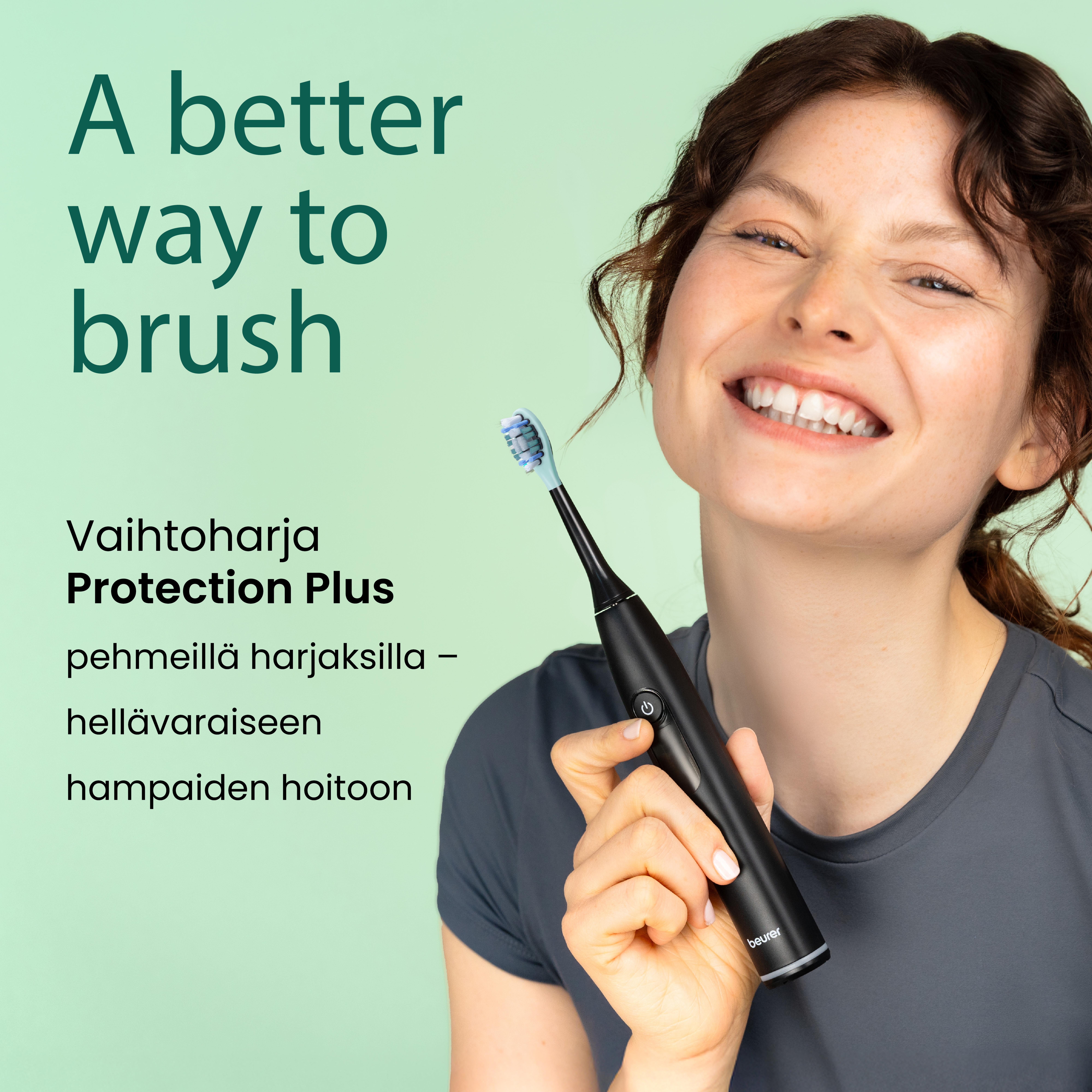 Vaihtosarja sisältää 4 Protection Plus vaihtoharjaa mustana, keskikovilla harjaksilla – hellävaraiseen hampaiden puhdistukseen.