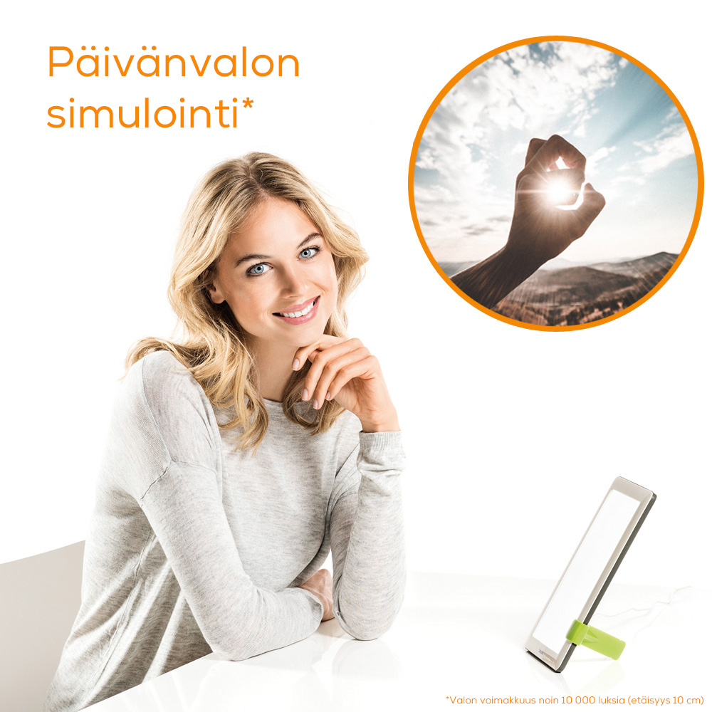 Vähän auringonpaistetta sisältävinä kuukausina valon puute aiheuttaa usein oireita, kuten energian puutetta, unen tarvetta, ruokahaluttomuus ja keskittymisvaikeutta. Kirkasvalolamppumme voi torjua näitä oireita ja simuloida päivänvaloa yli 10 000 luksin teholla.