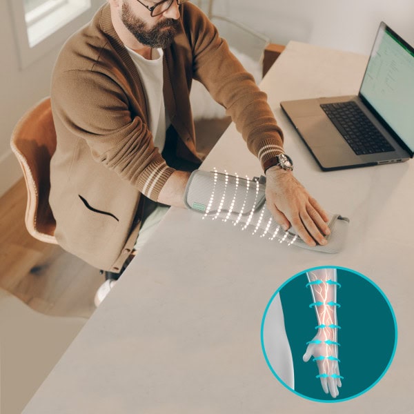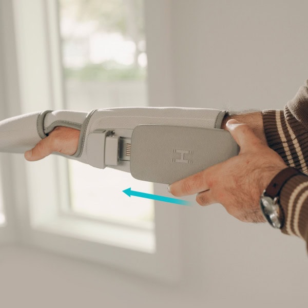 Erikseen myytävällä universaalilla ohjainyksiköllä toimiva rannetuki on kevyt, langaton ja helppokäyttöinen. Voit nauttia tehokkaasta ja kannettavasta kompressiohieronnasta jopa viiden tunnin ajan – niin kotona kuin liikkeellä ollessasi.