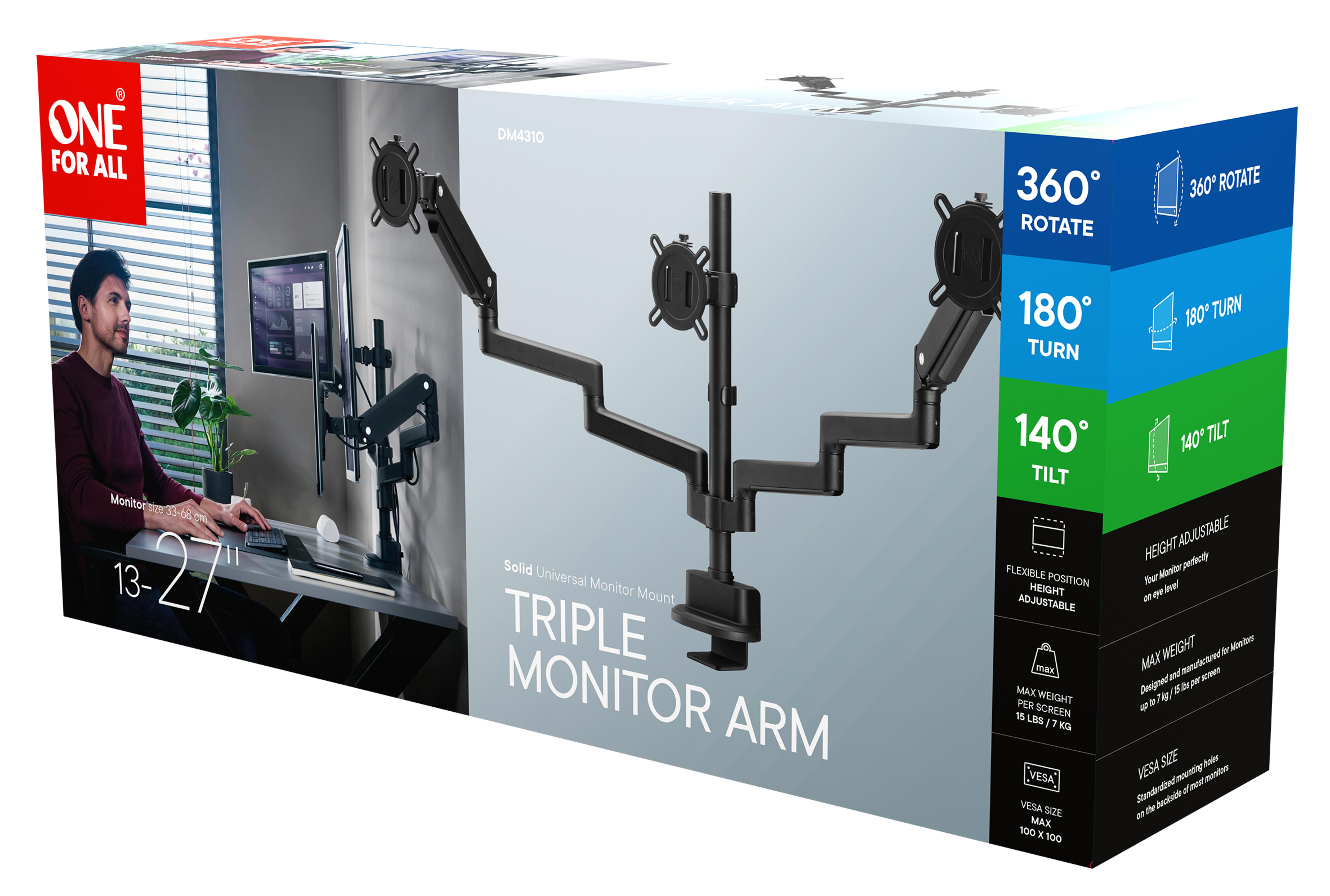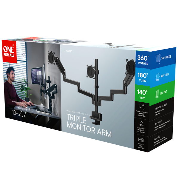 Paranna työpisteesi toimivuutta One For All universaalilla kolmen monitorin varrella. Tämä monipuolinen ratkaisu tarjoaa täydet säätömahdollisuudet: 360° kierto, 180° kääntö ja 140° kallistus mahdollistavat näytön asettamisen maksimaalista mukavuutta ja tehokkuutta varten. Säädä 13–27 tuuman näytöt juuri omien tarpeidesi mukaisesti, jotta saavutat ihanteellisen korkeuden ja katselukulman.