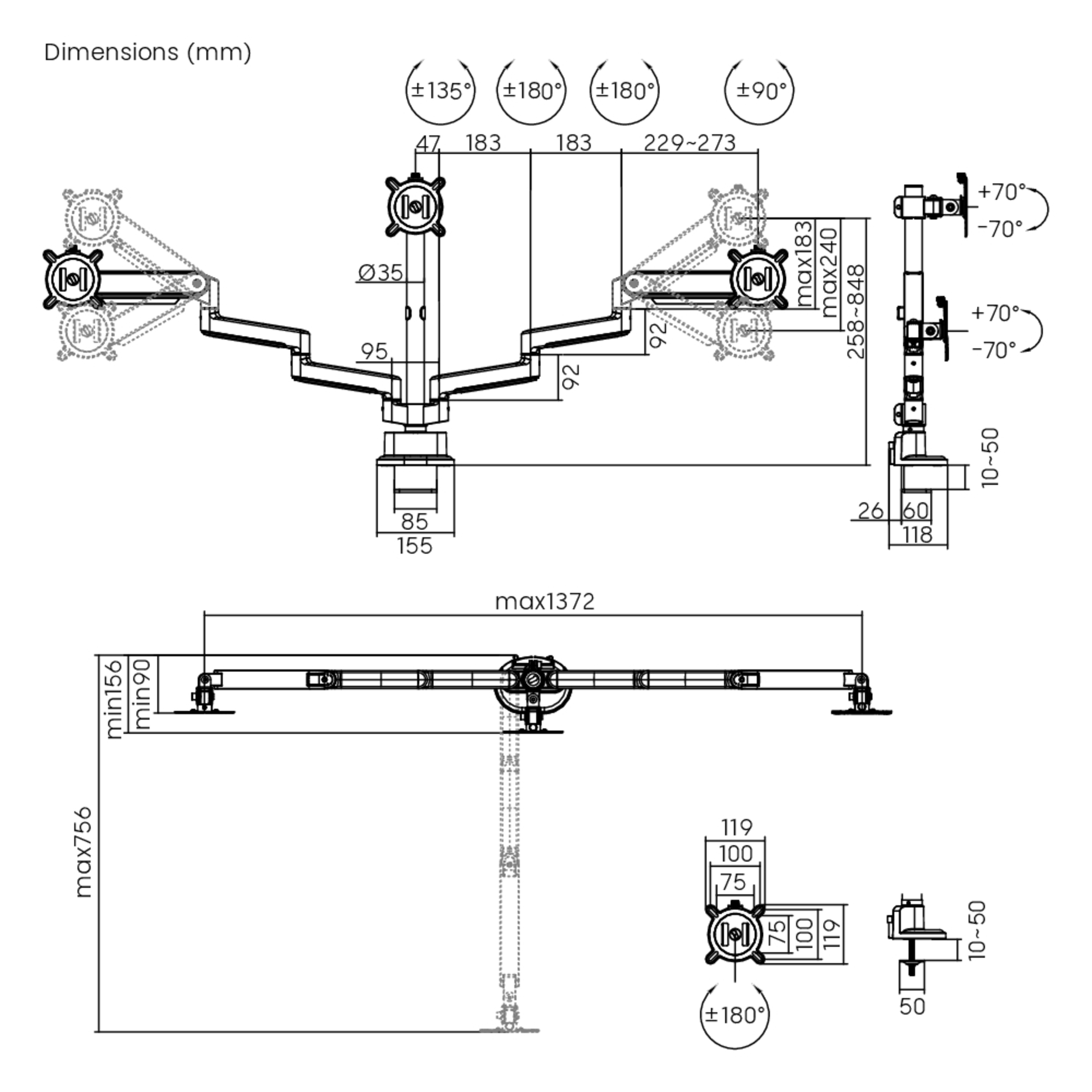Monitorivarret voidaan kiinnittää joko puristimella tai läpivientikiinnityksellä, mikä takaa tukevan ja turvallisen asennuksen lähes kaikille pöydille. Säädettävän jännityksen ansiosta voit kiristää varren pitämään näytön paikallaan tai löysätä sitä sujuvaa liikuttelua varten. Integroitu kaapelinhallinta pitää työpisteesi siistinä ja järjestyksessä.