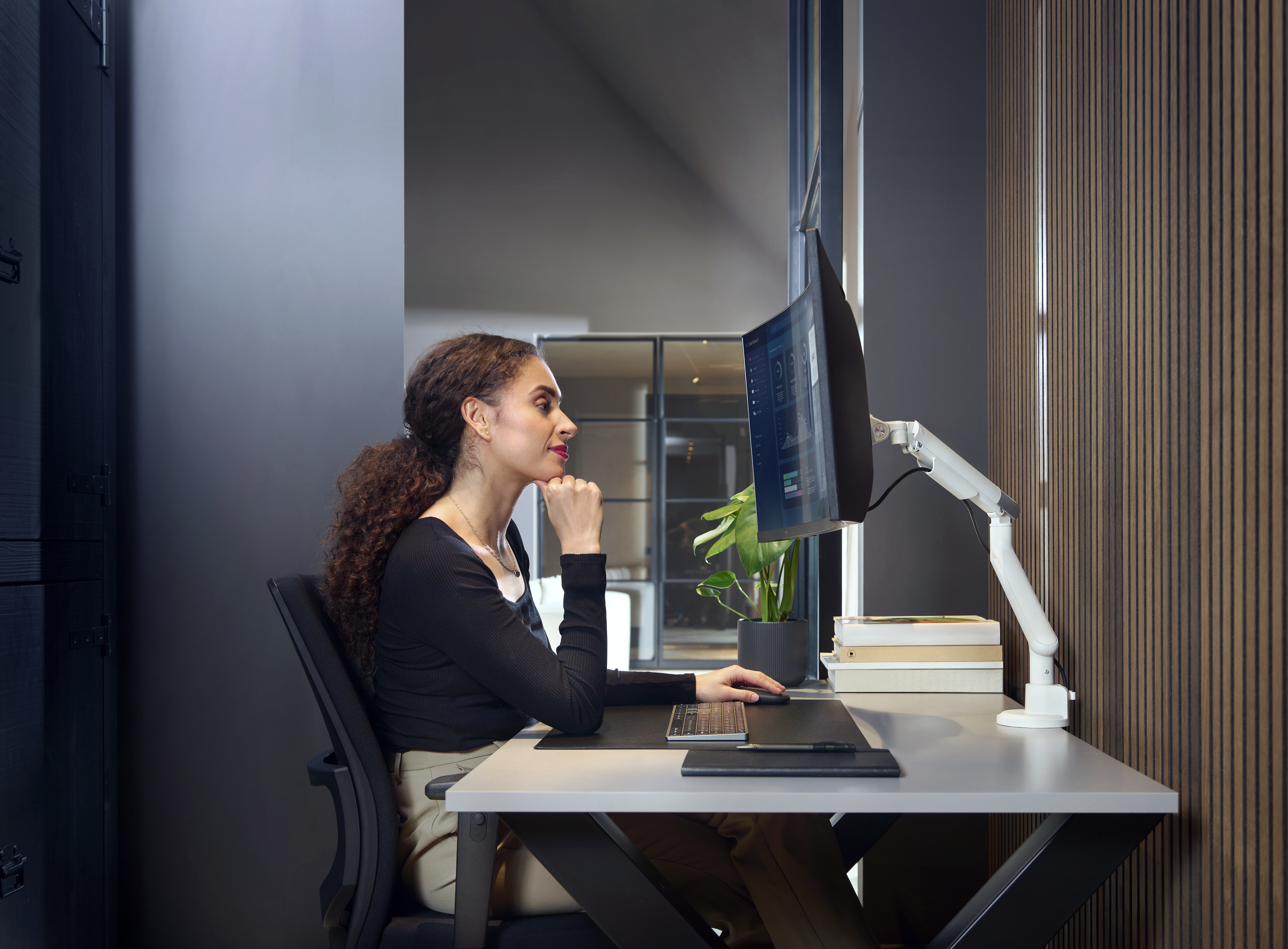 Monitorivarren tyylikäs muotoilu tuo työtilaasi nykyaikaista estetiikkaa. Se varmistaa, että monitorisi pysyy turvallisena ja vakaana, mutta se myös maksimoi työpöytätilan ja tarjoaa tilaa muille tärkeille tarvikkeille.