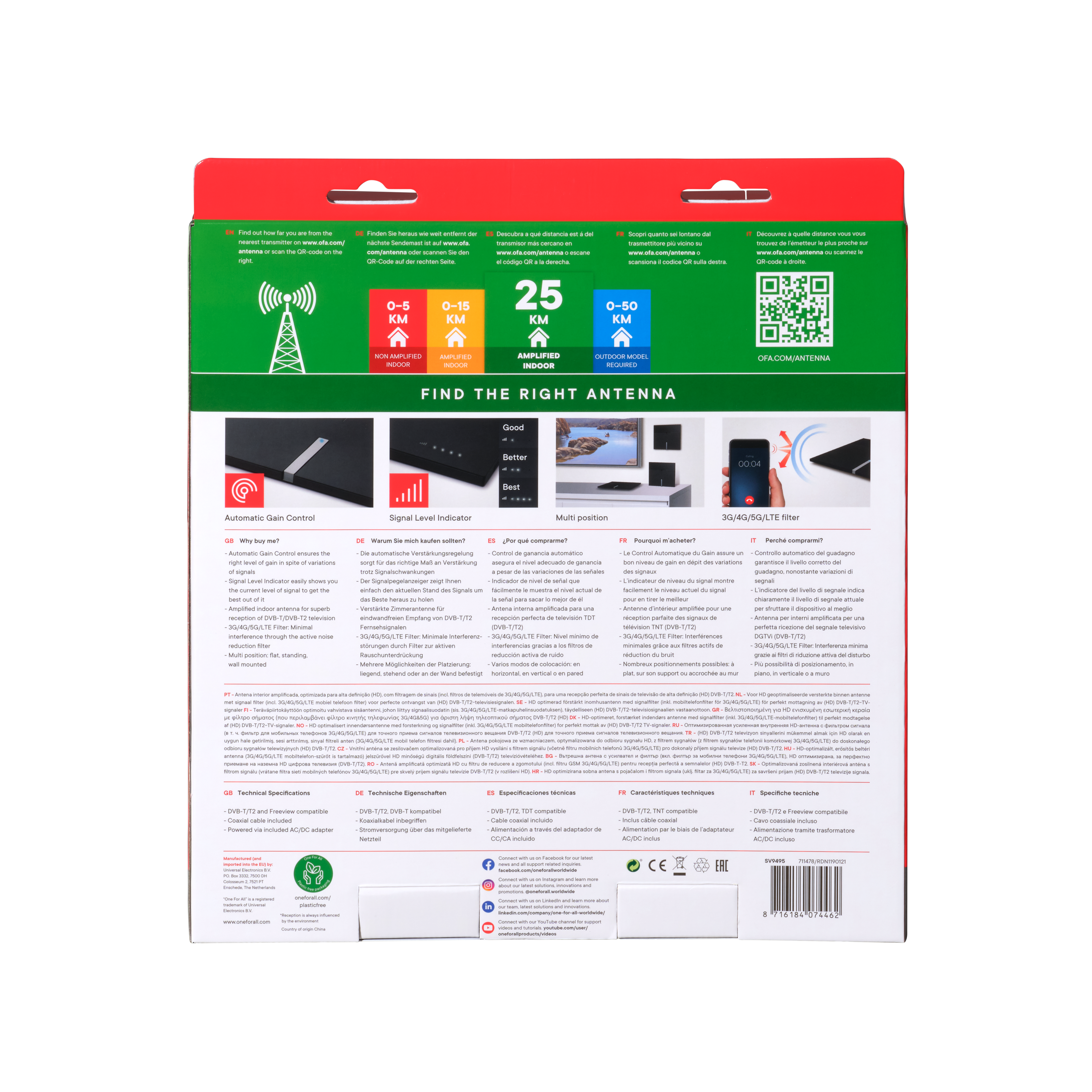 One For All SV9495-5G antennissa on sisäänrakennettu tehokas vahvistin sekä 3G/4G/5G suodatin. Antennilla voidaan vastaanottaa UHF/VHF lähetyksiä noin 25kilometrin päästä lähetinmastosta. Antennilla voidaan vastaanottaa DVB-T/DVB-T2 ohjelmia myös 4K ultra HD formaatissa.