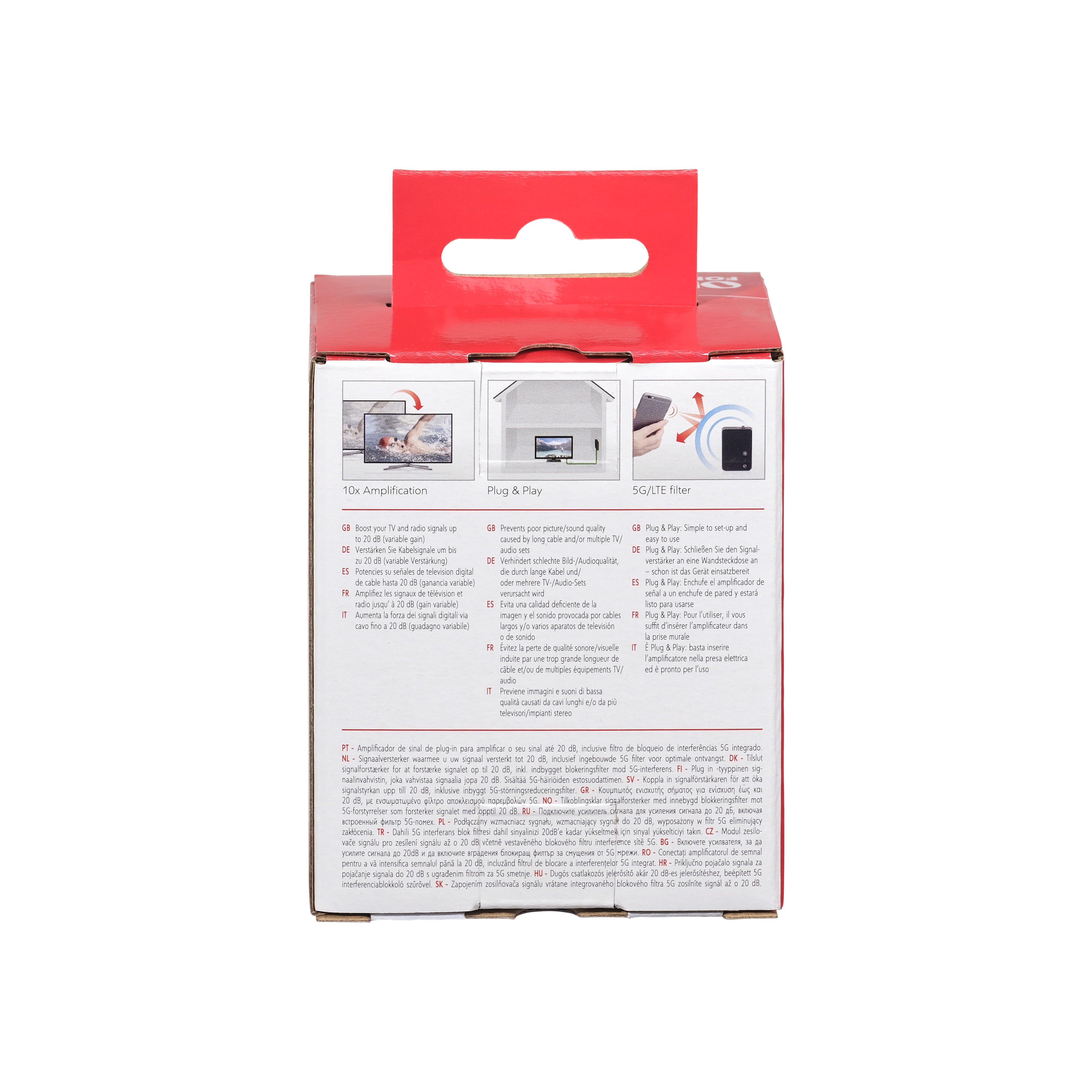 Vahvistimella voit vahvistaa antennisignaalia aina 20dB saakka. Vahvistinta on helppo käyttää – kytke vain johdot kiinni ja asennus on valmis. Vahvistimessa on sisäsäänrakennettu 3G/4G/5G suodatin joka poistaa mahdolliset häiriöt joita mobiili laitteet saattavat aiheuttaa.