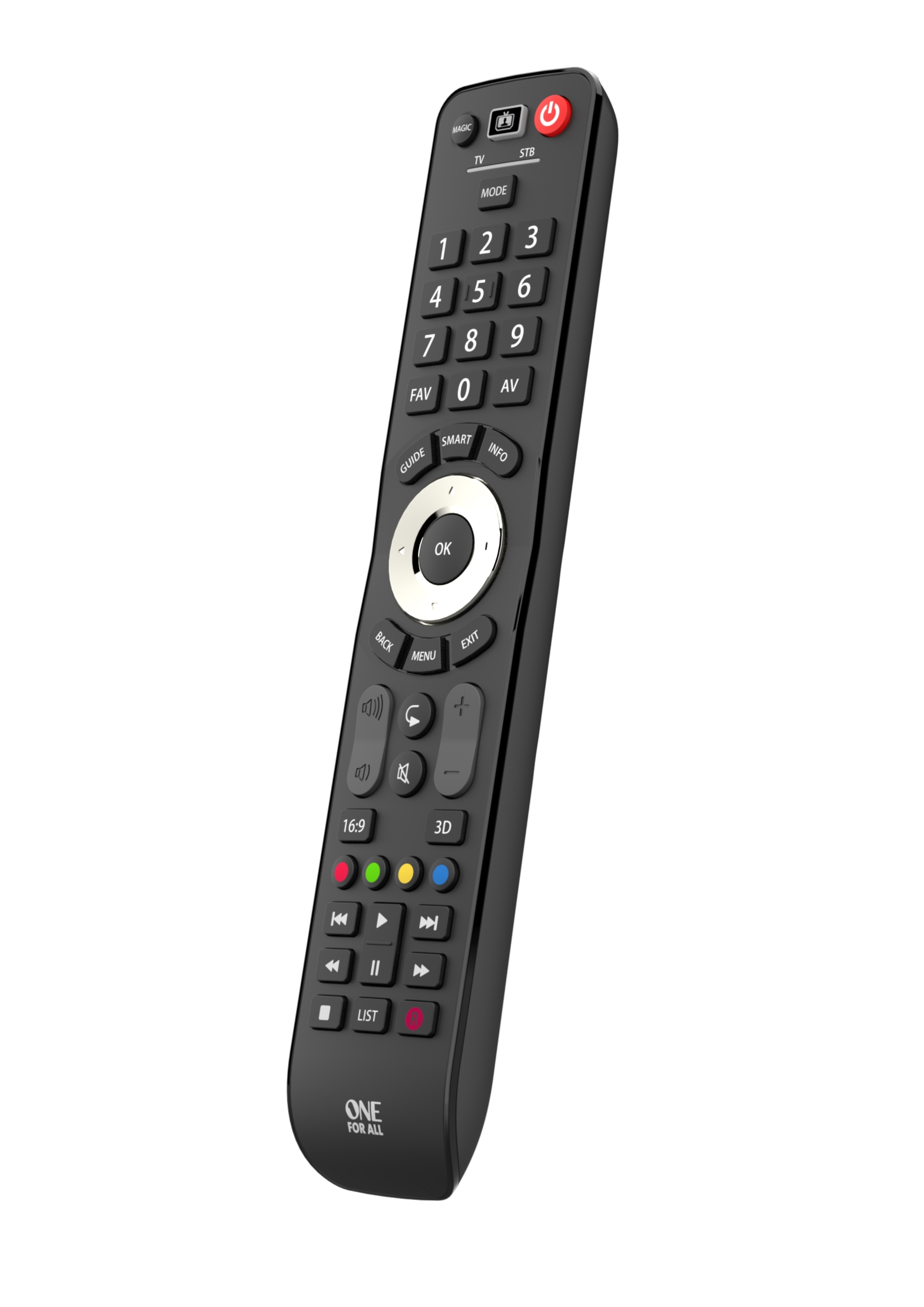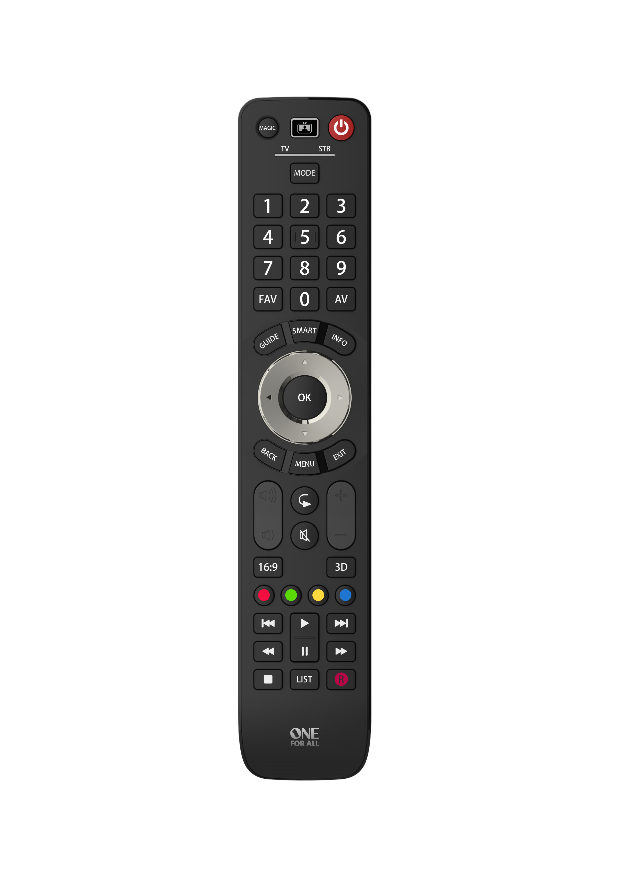 One For All Evolve 2 yleiskaukosäätimellä saat ohjattua kaikenmerkkiset ja malliset TV:t sekä digiboksit. Evolve säätimessä on normaalia tehokkaampi infrapunalähetin jonka ansiosta säätimellä ei tarvitse edes osoitta laitteeseen päin. Säätimessä on myös ”SMART” painike – Kaiken mallisia Smart televisioita varten. Säätimestä löytyy myös ”3D” painike, 3D televisioita varten. Säätimeen voidaan tarvittaessa opettaa toimintoja myös alkuperäisestä säätimestä. Säätimessä on myös ”Watch TV” toiminto jolla saat yhden napin painalluksella TV:n ja Digiboksin päälle kerralla Säädin toimii 2xAAA paristoilla.