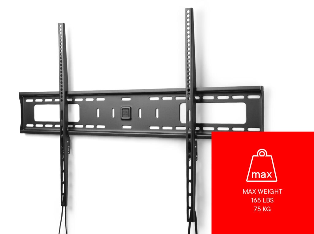Jumbo-kokoinen kiinteä seinäteline sopii 42–120 tuuman televisioille ja on yhteensopiva VESA-kokojen kanssa, jotka ovat enintään 900 x 600. Tämä seinäteline on suunniteltu erityisesti suurille televisioille, ja se kestää enintään 75 kg:n painon. Kiinnitä televisio helposti telineeseen integroidulla lukitus- ja vapautusmekanismilla. Jos haluat irrottaa television seinästä, avaa vain lukitus ja vapauta. Seinätelineen korkeutta voidaan säätää helposti asennuksen jälkeen. Voit aina olla varma, että televisio on suorassa. Riippumatta siitä, onko seinäsi puusta tai metallista, voit kiinnittää tämän seinätelineen seinän runkopalkkeihin joiden välinen etäisyys on jopa 800 mm. Kaikki asennusmateriaalit, kuten ruuvit, vesivaaka, betoni-ankkurit ja välikappaleet, toimitetaan kiinnikkeen mukana, jotta asennus sujuu nopeasti ja helposti. Voit myös ladata ilmaisen One For All -sovelluksen, joka sisältää käteviä asennustyökaluja. One For All -televisioseinätelineet sopivat kaiken tyyppisille televisioille ja kaikille tuotemerkeille.