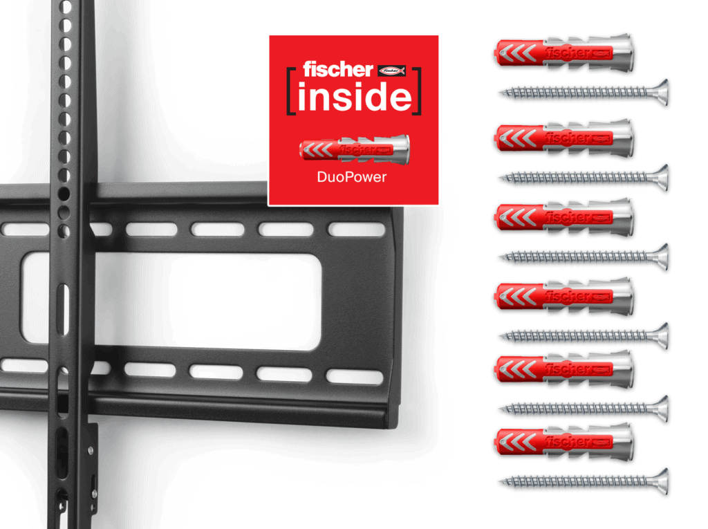 Sinun ei tarvitse etsiä sopivia ruuveja tämän seinätelineen asennusta varten. Kaikki asennusmateriaalit, kuten ruuvit, betoni-ankkurit ja välikappaleet, toimitetaan seinätelineen mukana, jotta asennus sujuu nopeasti ja helposti.