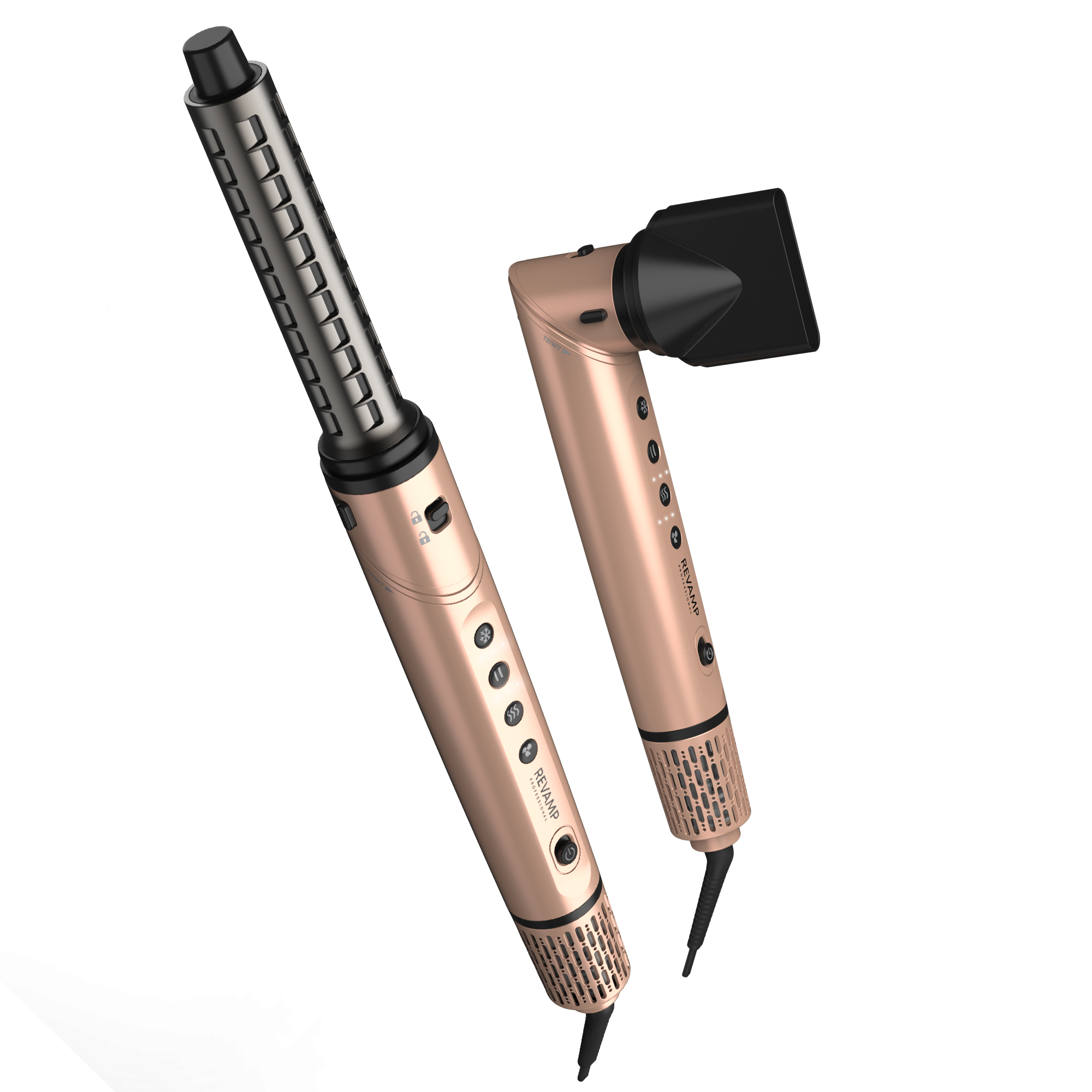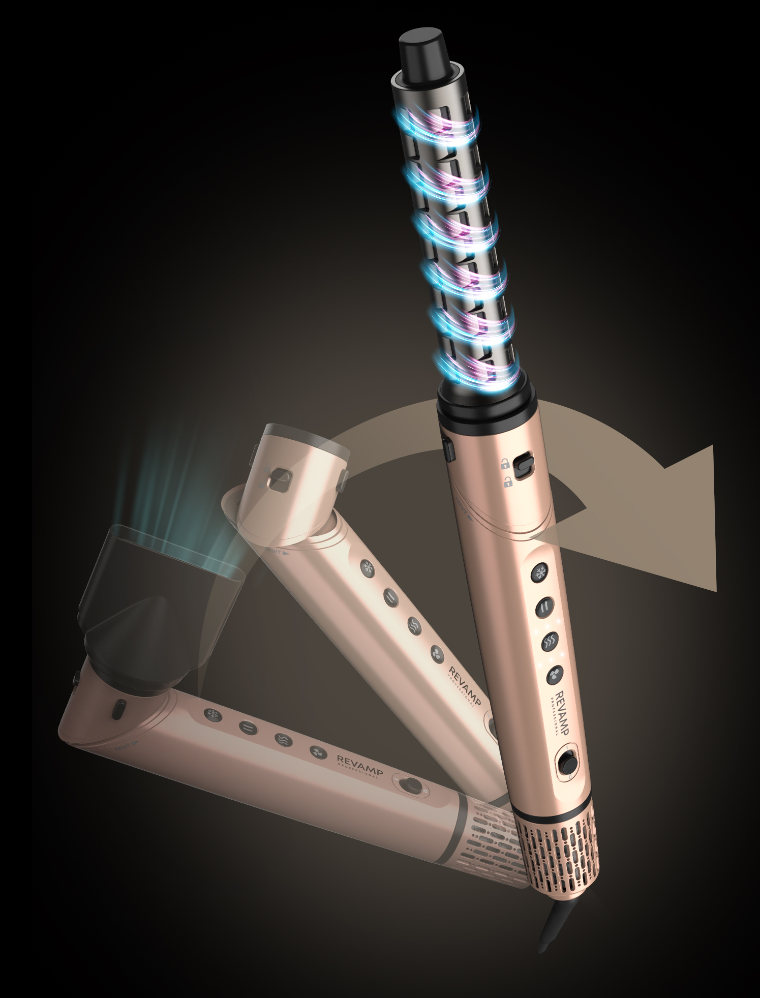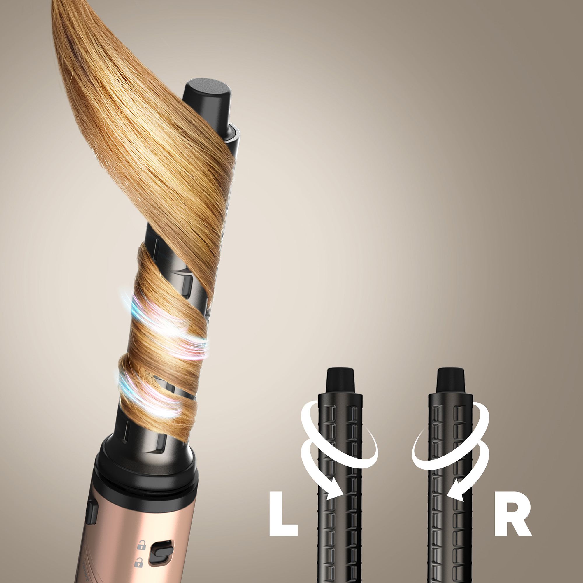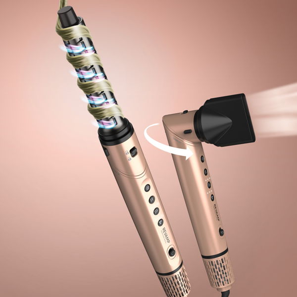 Kaksi monisuuntaista Auto Air Curl -kiharrinpäätä (yksi vasemmalle ja yksi oikealle kääntyville kiharoille) takaavat virheettömän lopputuloksen. Kiharrinpäät kietovat hiukset automaattisesti luoden suuret, kimmoisat kiharat tai pehmeät, luonnollisesti laskeutuvat aallot.