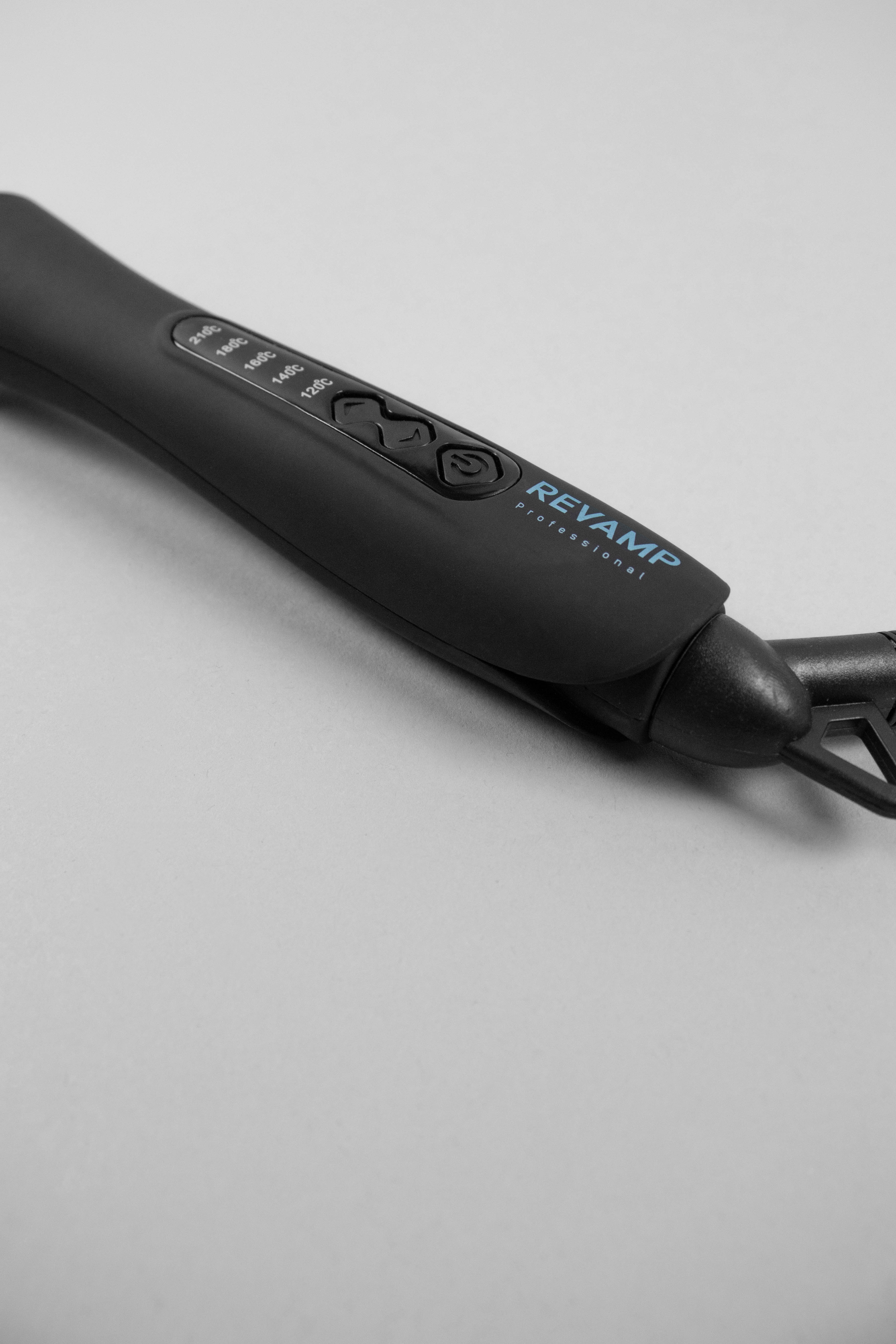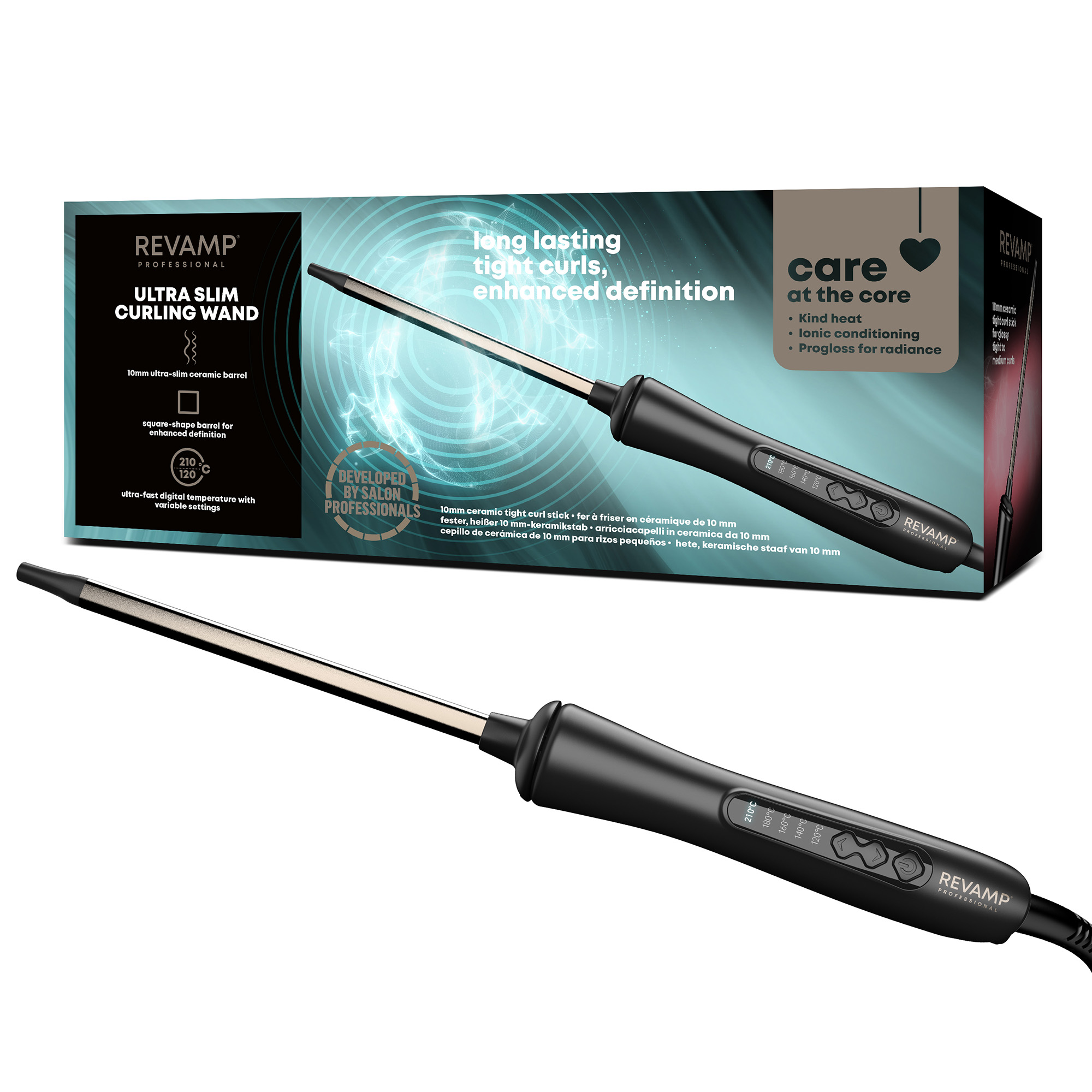 Anna kiharoillesi hieman lisää särmää. Erittäin ohut, neliönmuotoinen 10 mm keraaminen varsi auttaa luomaan täydellisen tiukat ja selkeästi erottuvat kiharat tai veistokselliset Hollywood-aallot REVAMP Ultra Slim Curling Wand -kihartimella.