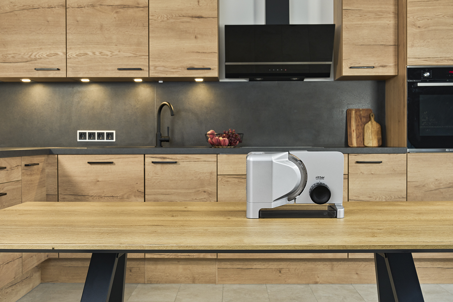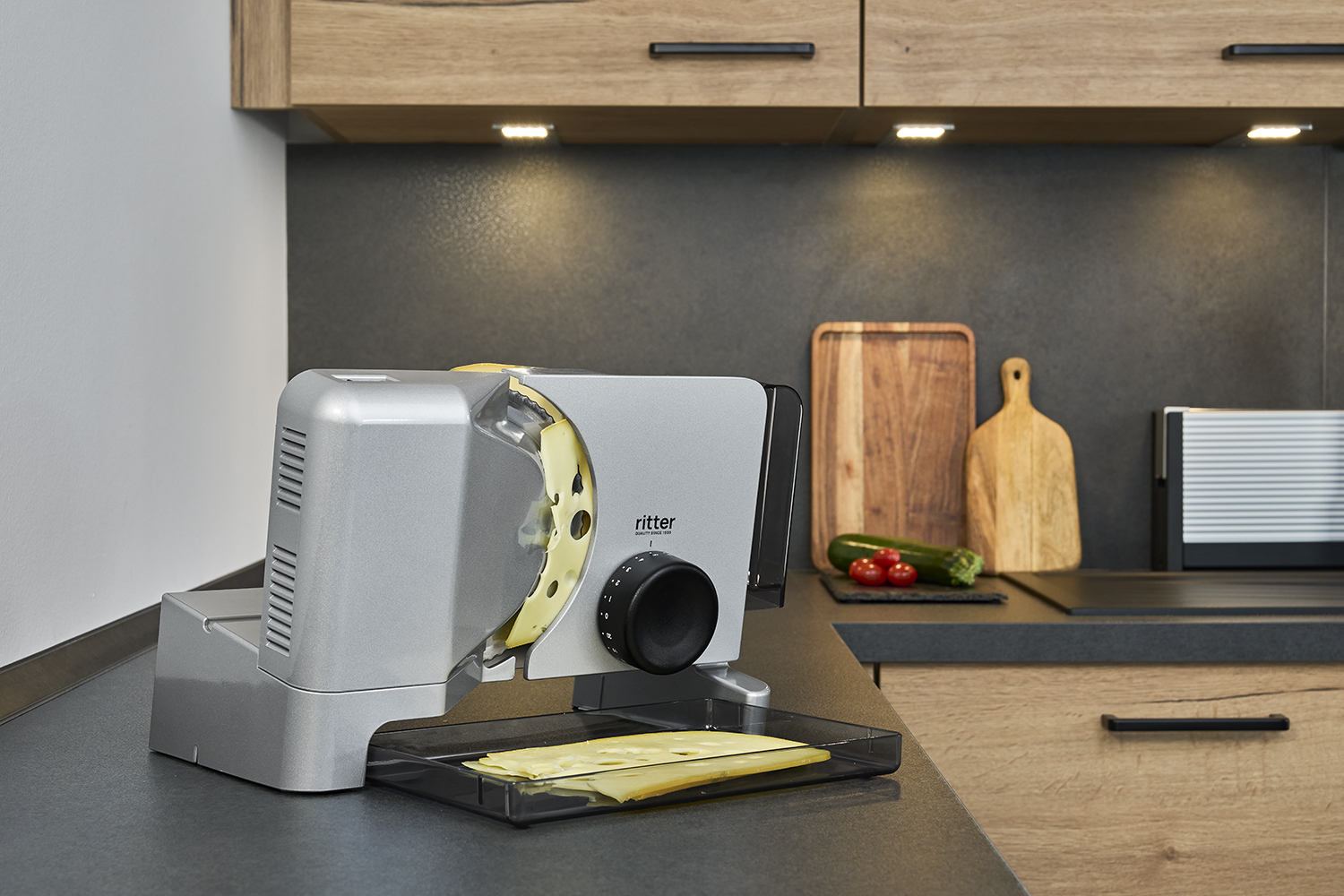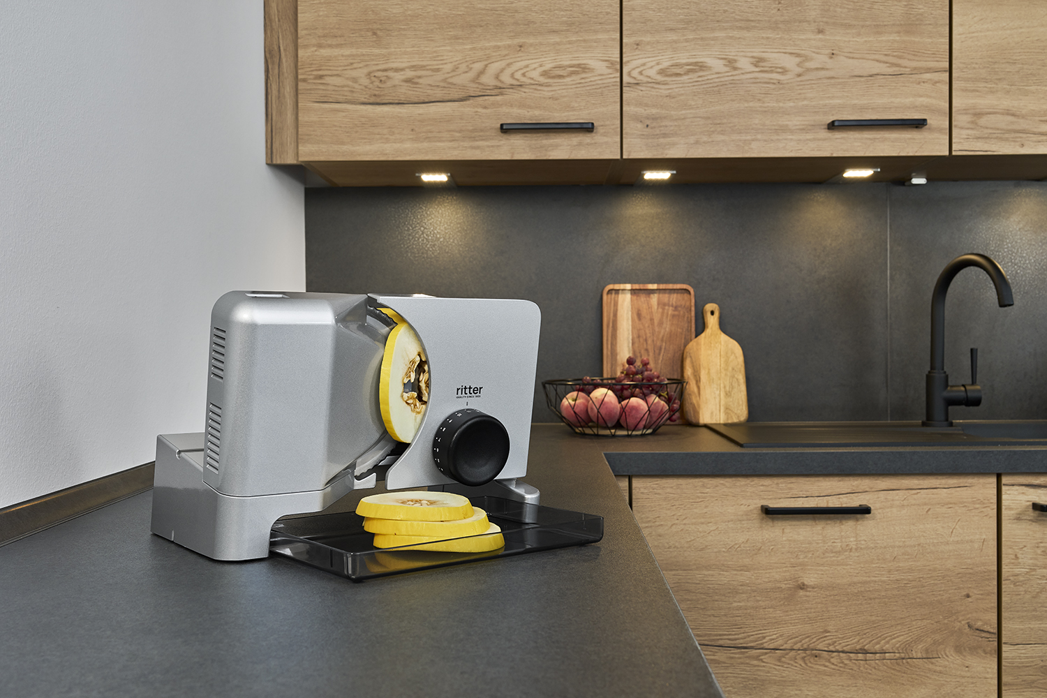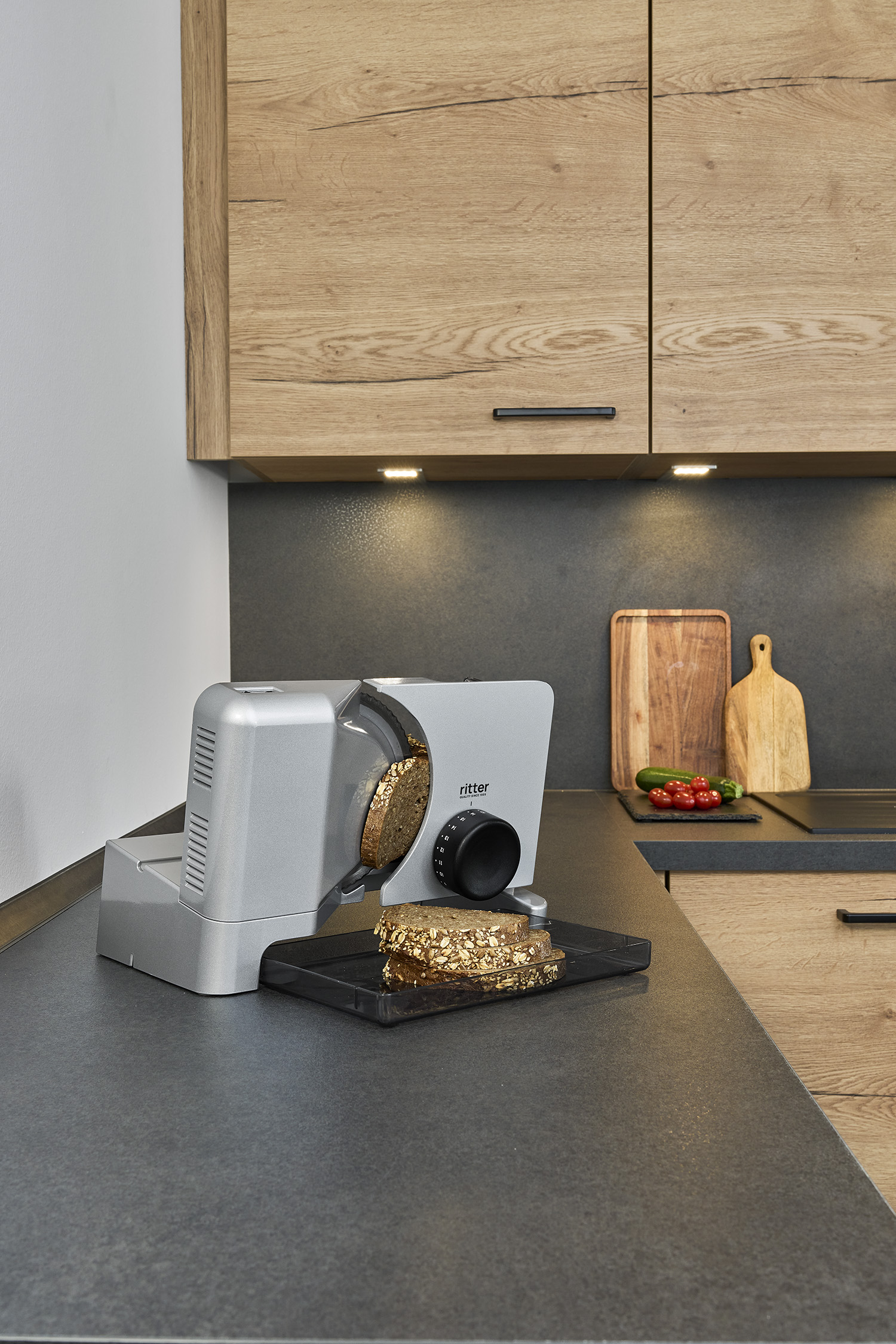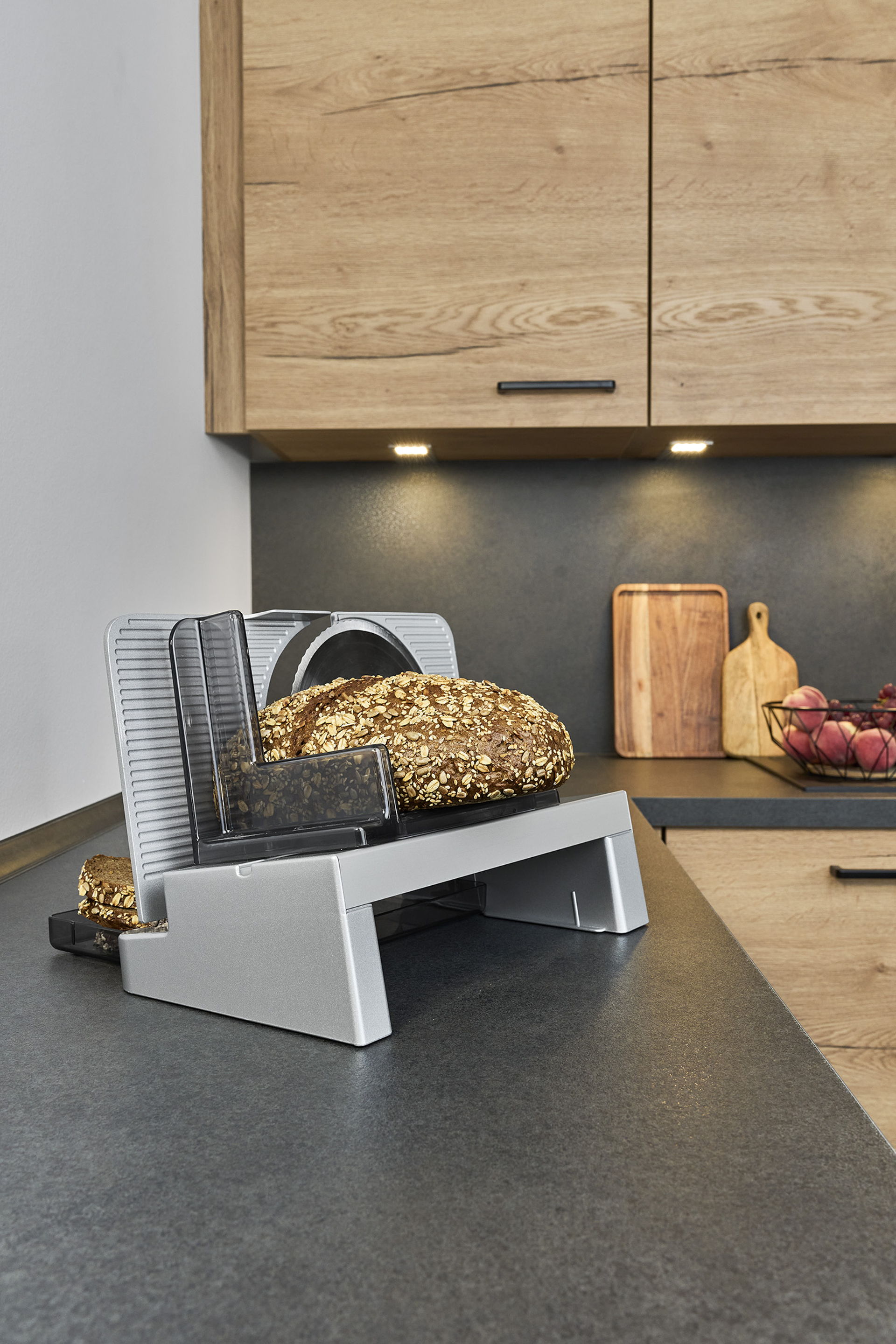 Viipaloitujen elintarvikkeiden keräämiseen tarkoitettu ruokatarjotin on sijoitettu pyöröterän alle niin, että viipaleet voivat pudota suoraan sen päälle. Viipaloitu tuote voidaan tarjoilla kätevästi ja suoraan korkealaatuisesta, helposti puhdistettavasta muovista valmistetun käytännöllisen ruokatarjottimen avulla.