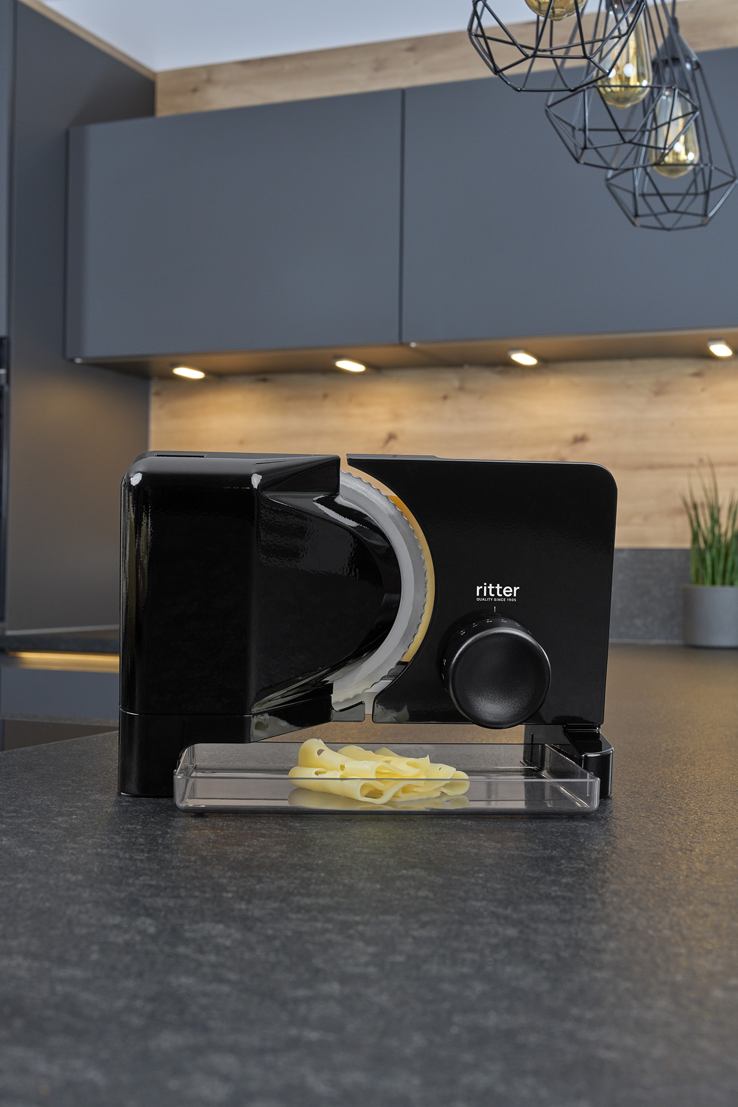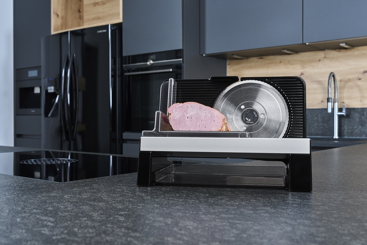 Viipaloitujen elintarvikkeiden keräämiseen tarkoitettu ruokatarjotin on sijoitettu pyöröterän alle niin, että viipaleet voivat pudota suoraan sen päälle. Viipaloitu tuote voidaan tarjoilla kätevästi ja suoraan korkealaatuisesta, helposti puhdistettavasta muovista valmistetun käytännöllisen ruokatarjottimen avulla.