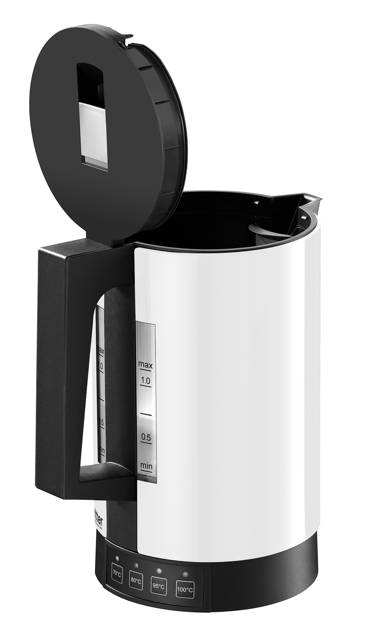 Laajasti avautuvan kannen ansiosta hanan alla olevan astian täyttäminen, puhdistaminen ja kalkinpoisto käyvät helposti. Lisäksi kiillotettu ruostumattomasta teräksestä valmistettu lämmitysalusta torjuu tehokkaasti kalkin kerääntymistä pohjaan.