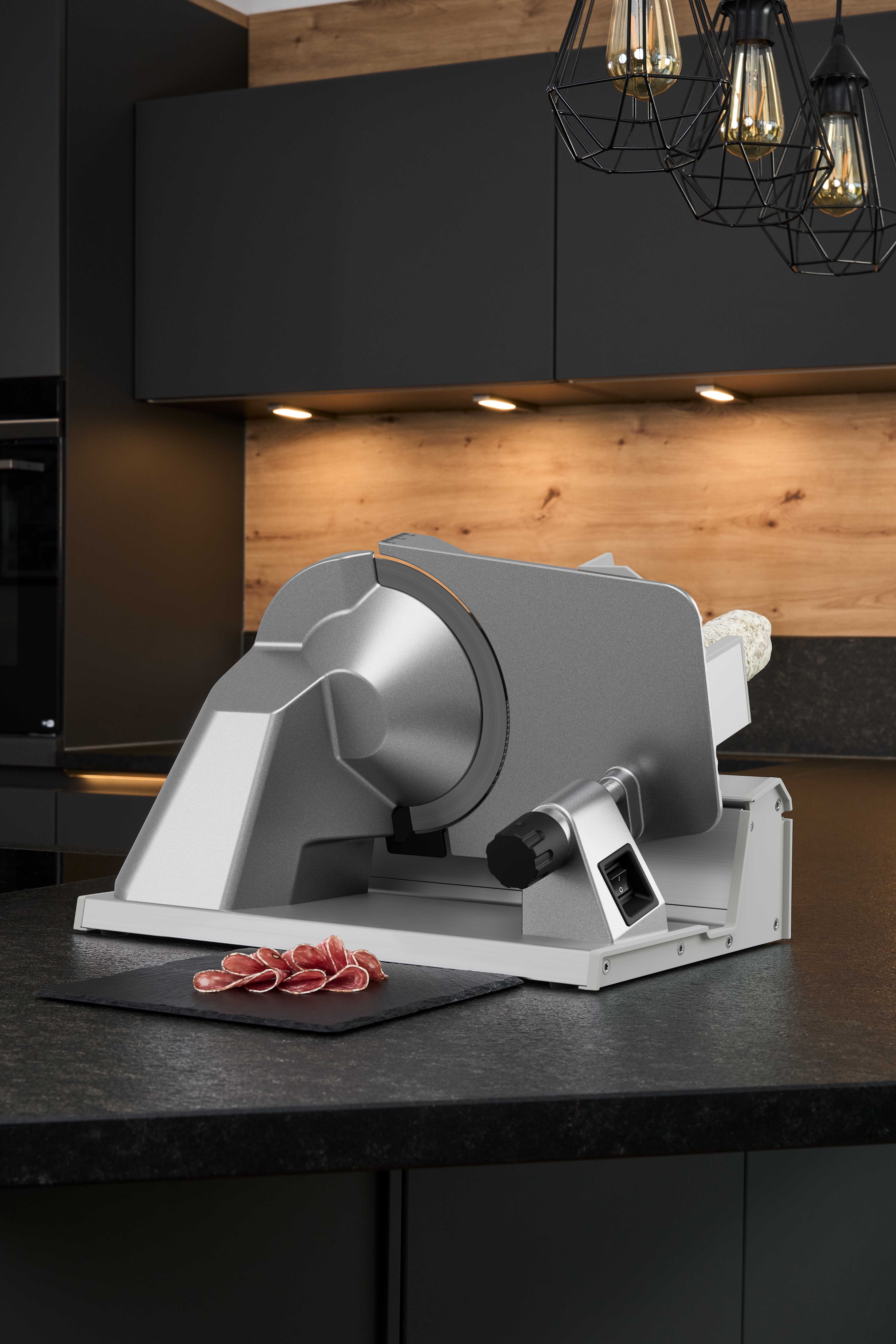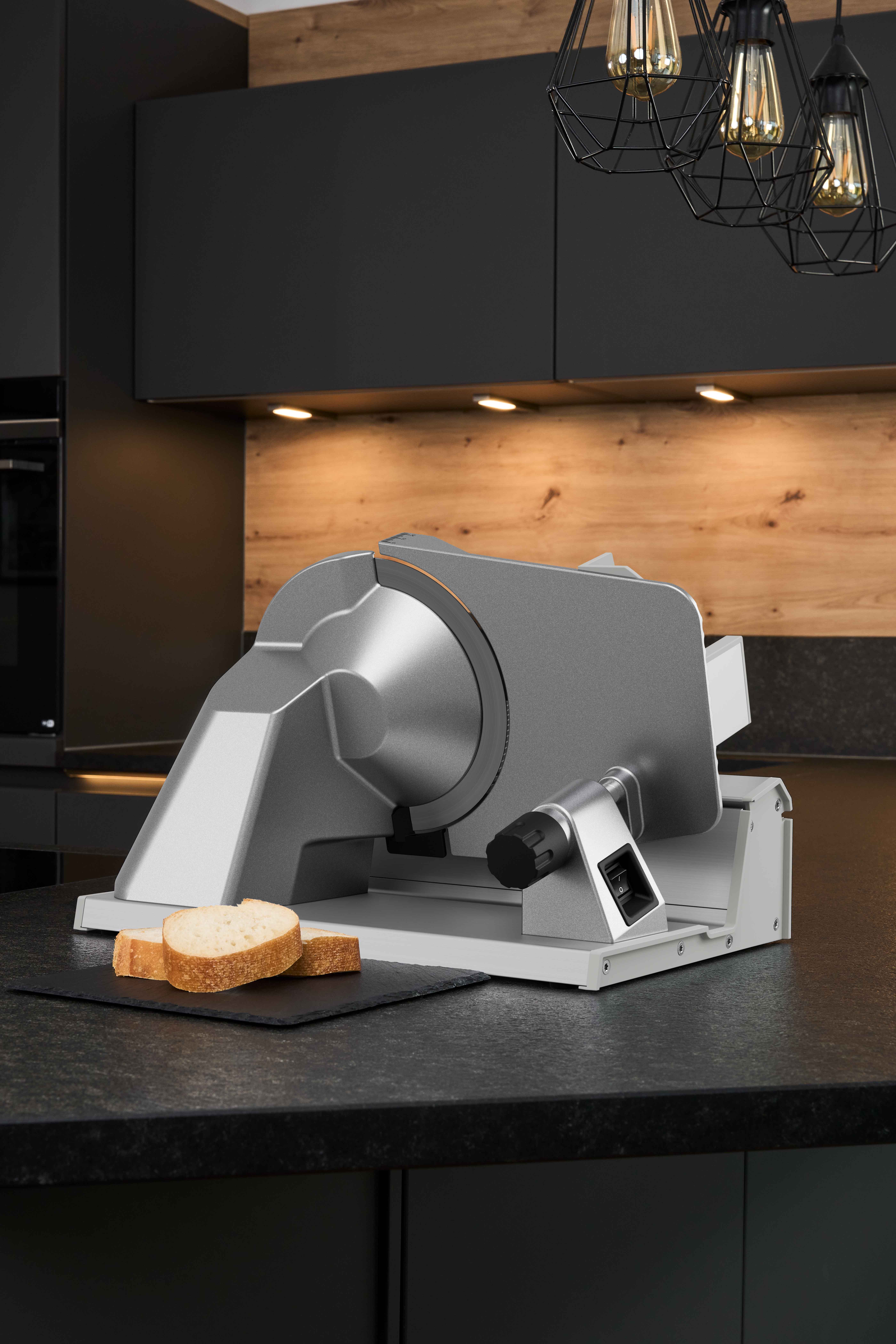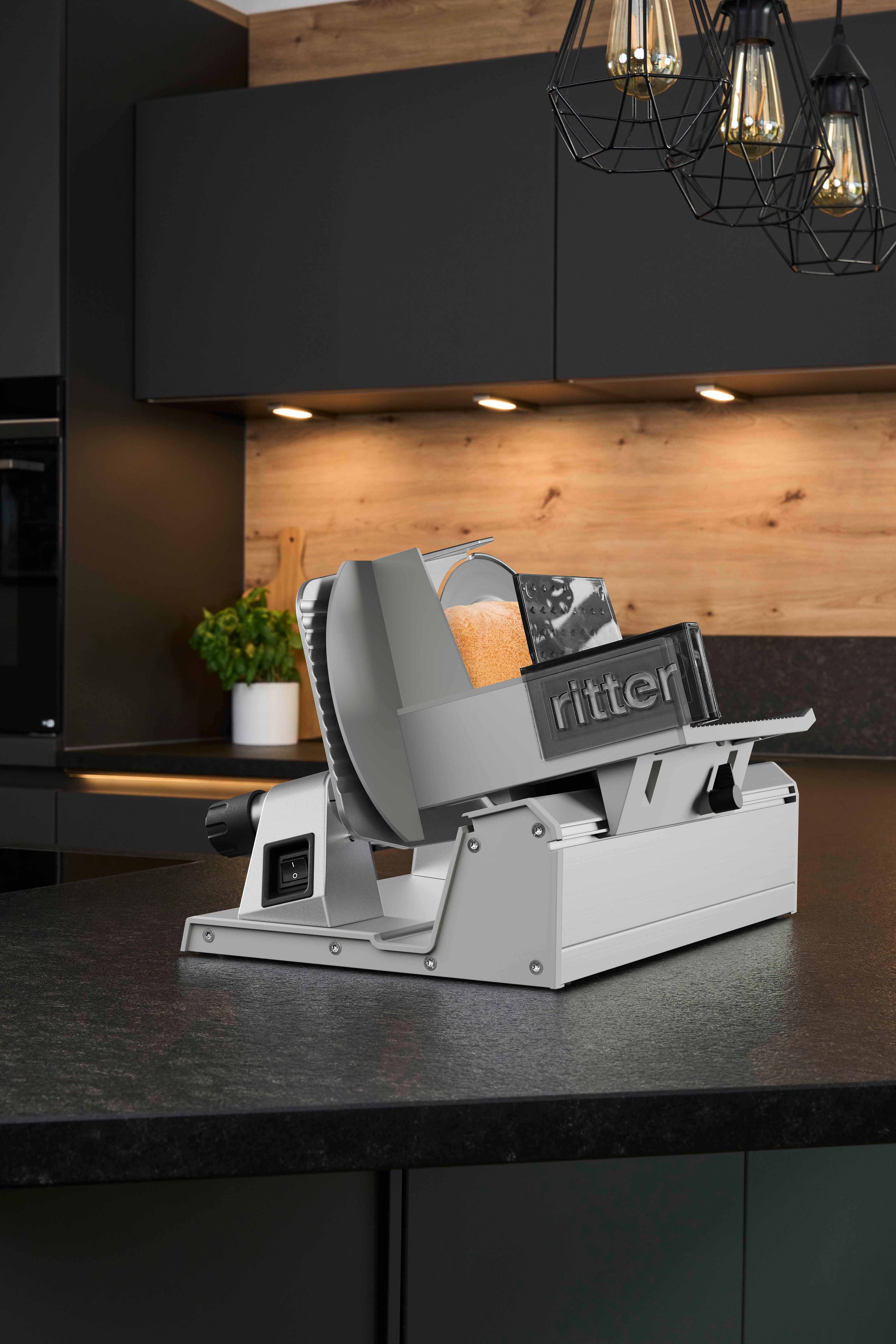 Tehokkaan, huoltovapaan kondensaattorimoottorin, tarkan 19 cm:n terän ja ainutlaatuisen moottoripään ansiosta ritter deli-siliker leikkaa kaiken aina vohvelinohuista kinkkuviipaleista täydellisen tasaisiin leipiin. Leikkuupaksuuden hienosäädön ansiosta, joka voidaan säätää 22 mm:iin asti, voit hallita jokaista viipaletta.