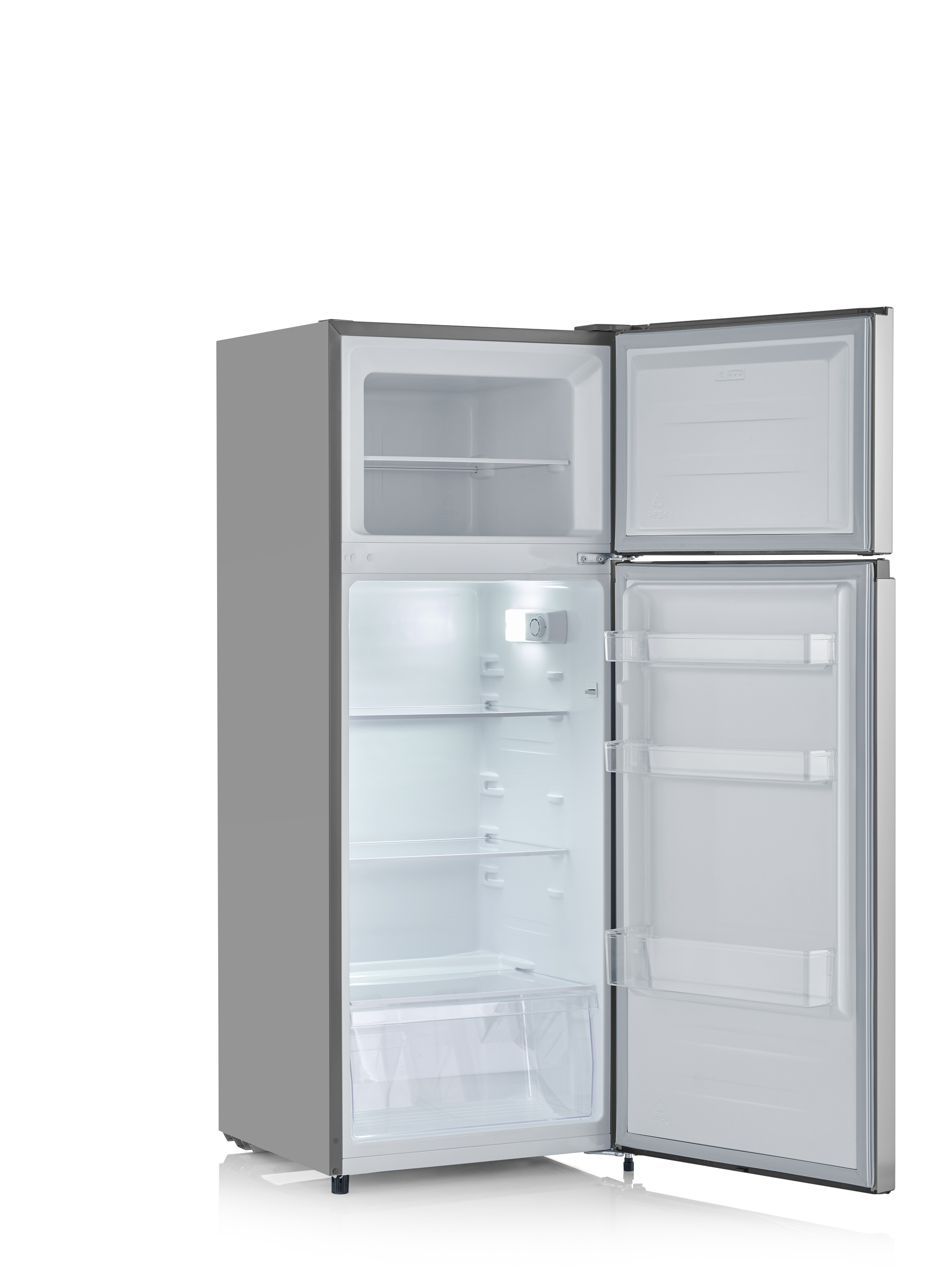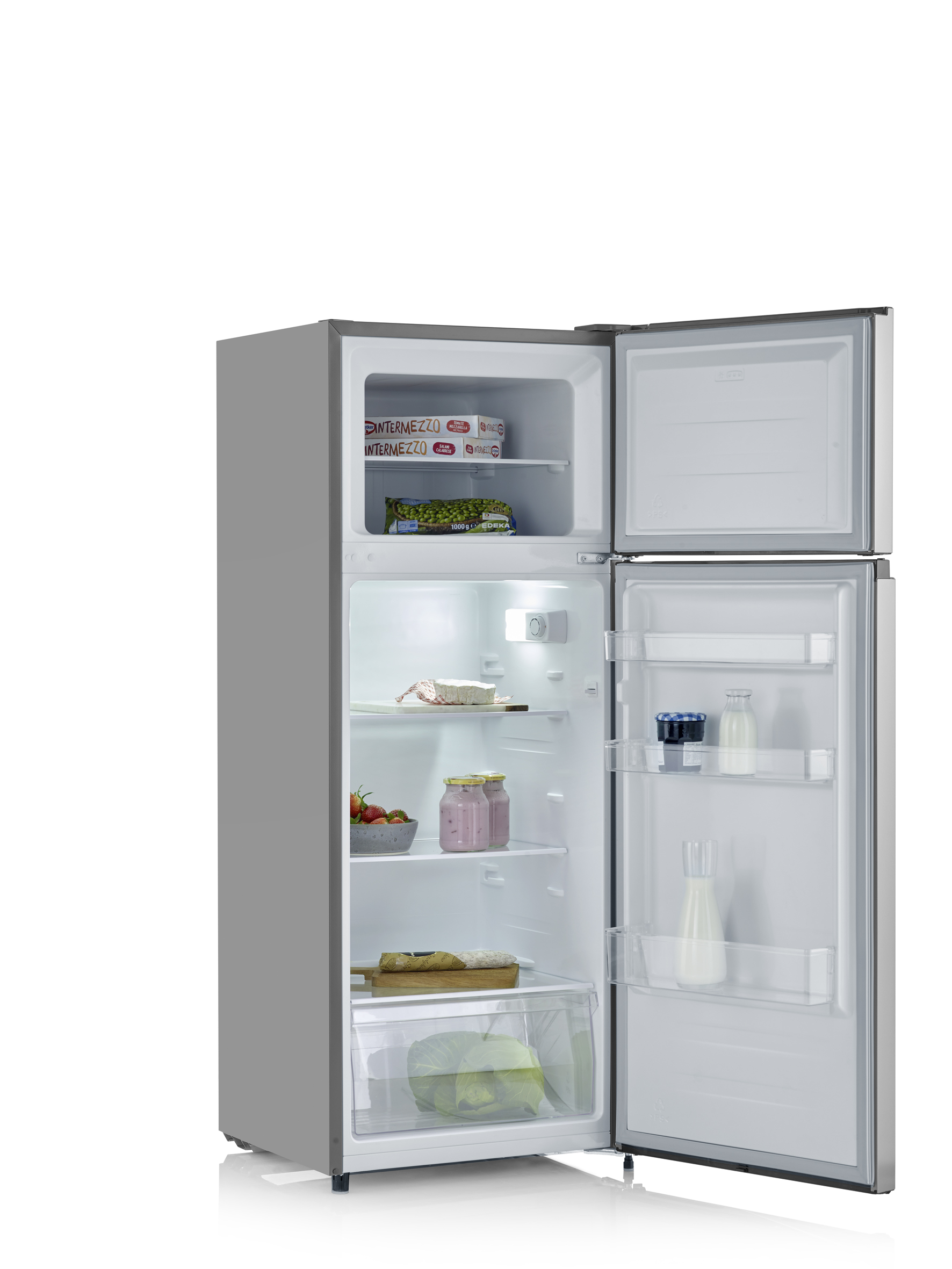 Jääkaapin (165 litraa) ja pakastimen (41 litraa) yhdistelmä, jossa pakastin on päällä. Kaapin korkeus on 144 cm ja leveys vain 55 cm. Moderni LED-valaistus, suuri vihanneslaatikko ja säädettävät hyllyt.
