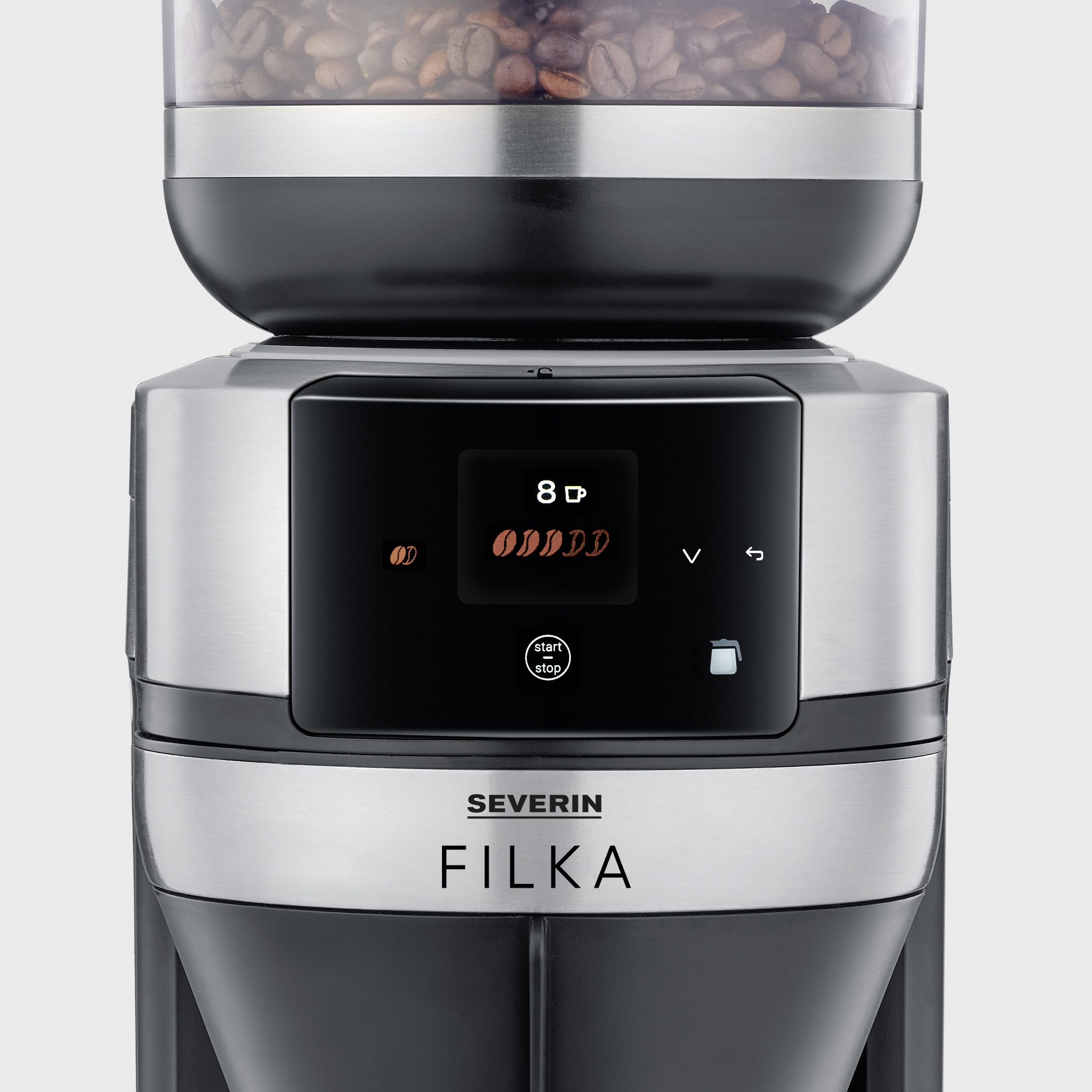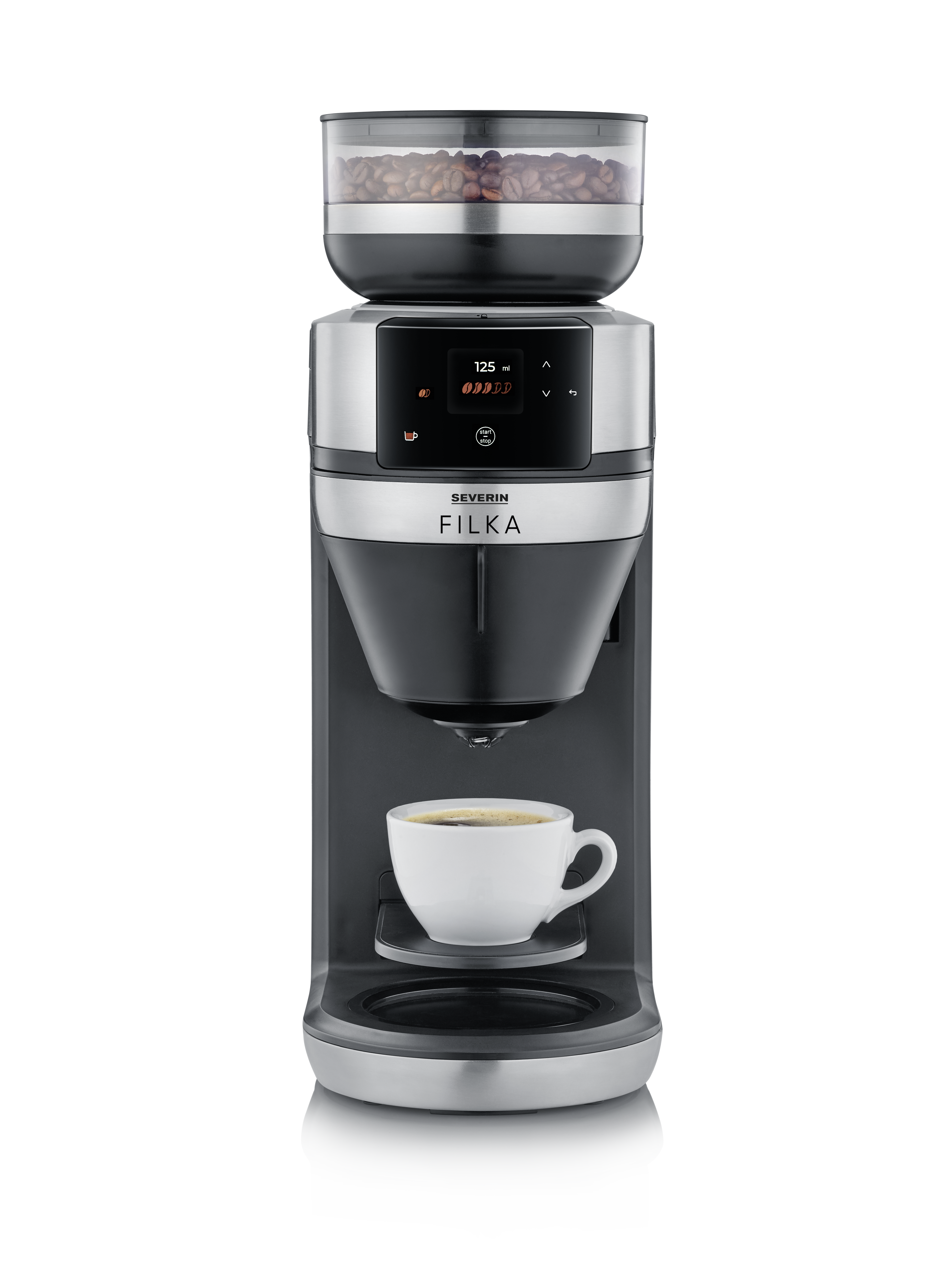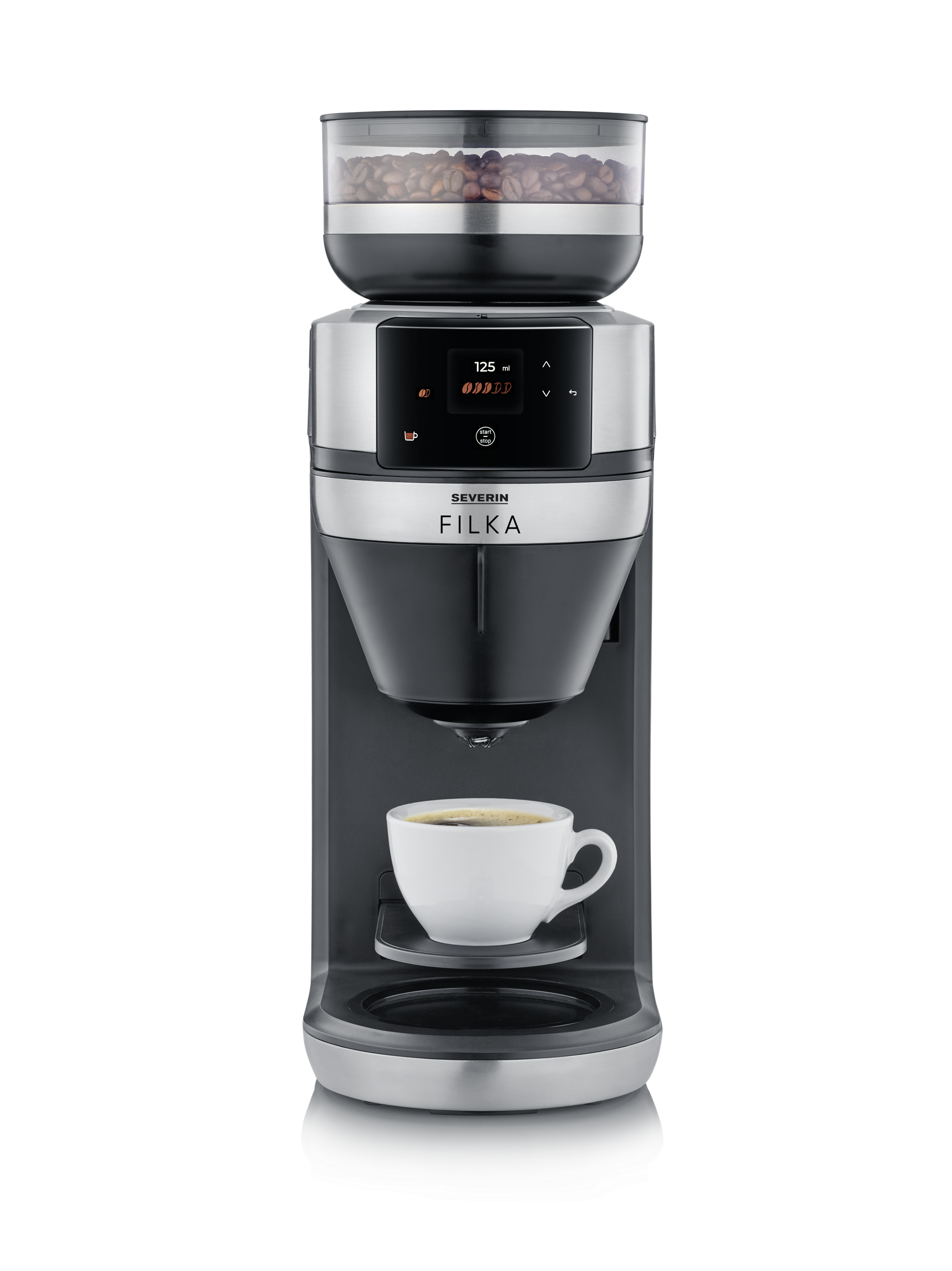 Ja se on niinkin yksinkertaista kuin tämä: valitse näytöstä haluamasi kahvimäärä, ja kahvipavut jauhetaan juuri sinulle. Sitten FILKA ottaa käytännöllisestä irrotettavasta vesisäiliöstään juuri sen verran vettä, mitä tarvitset haluamaasi kahvimäärään, ja keittää sen sinulle optimaalisessa lämpötilassa. Tuoksuu hyvältä, eikö vain?