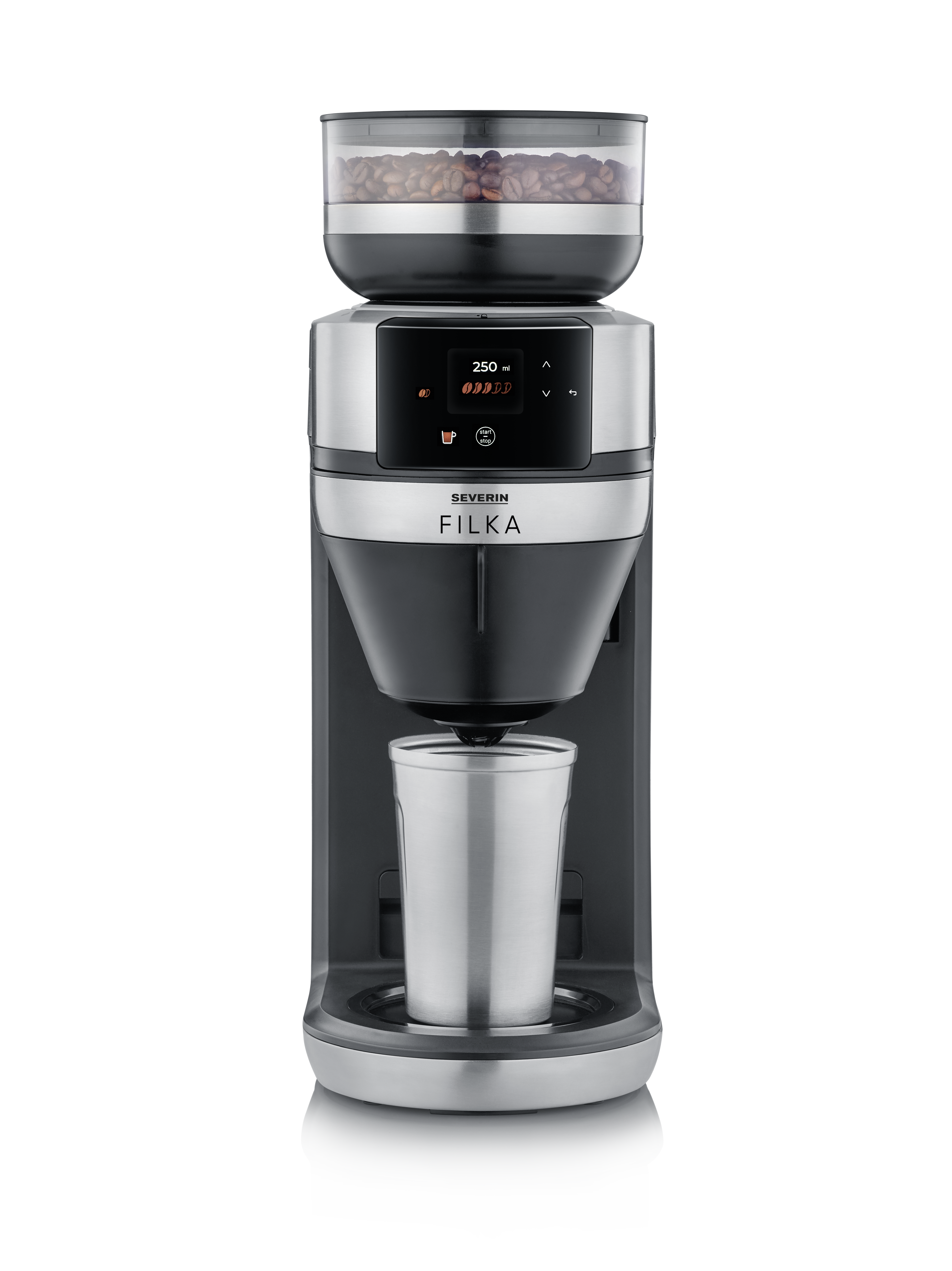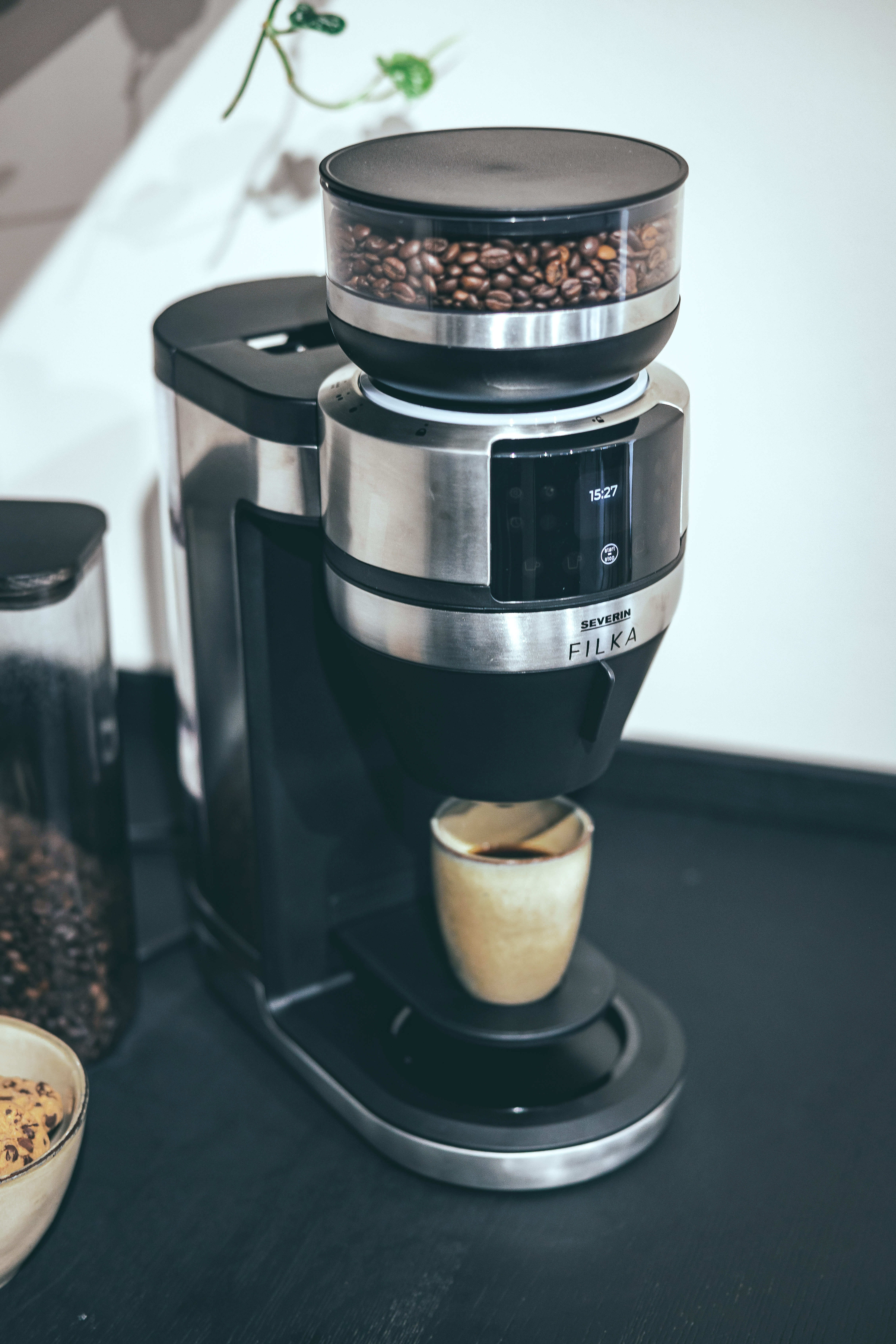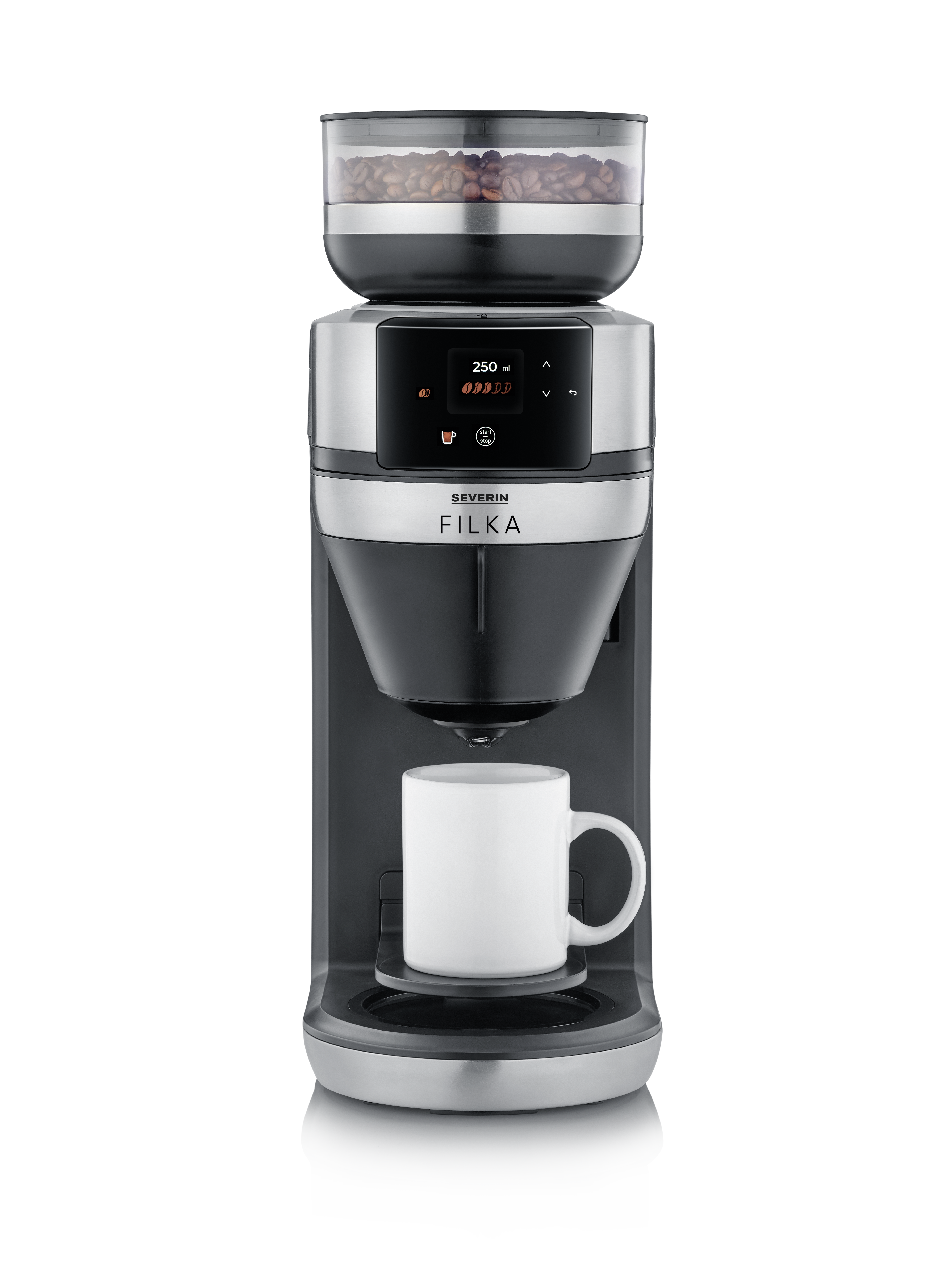 Ja se on niinkin yksinkertaista kuin tämä: valitse näytöstä haluamasi kahvimäärä, ja kahvipavut jauhetaan juuri sinulle. Sitten FILKA ottaa käytännöllisestä irrotettavasta vesisäiliöstään juuri sen verran vettä, mitä tarvitset haluamaasi kahvimäärään, ja keittää sen sinulle optimaalisessa lämpötilassa. Tuoksuu hyvältä, eikö vain?