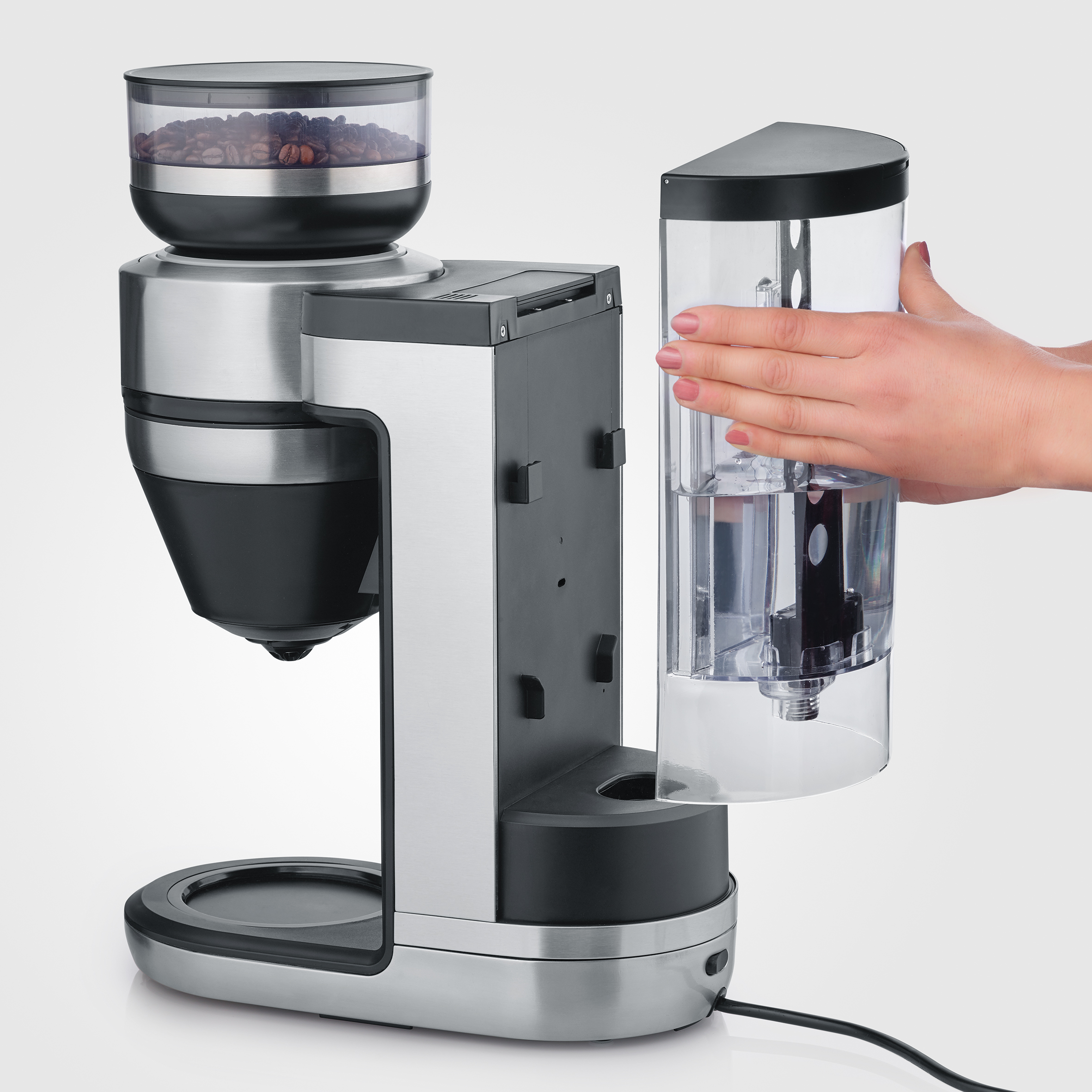 - Helppo puhdistaa: Irrotettava vesisäiliö on helppo täyttää. Mylly on helppo puhdistaa irrotettavan papusäiliön ansiosta. Myös jauheannostelija voidaan avata automaattisesti puhdistamisen helpottamiseksi.