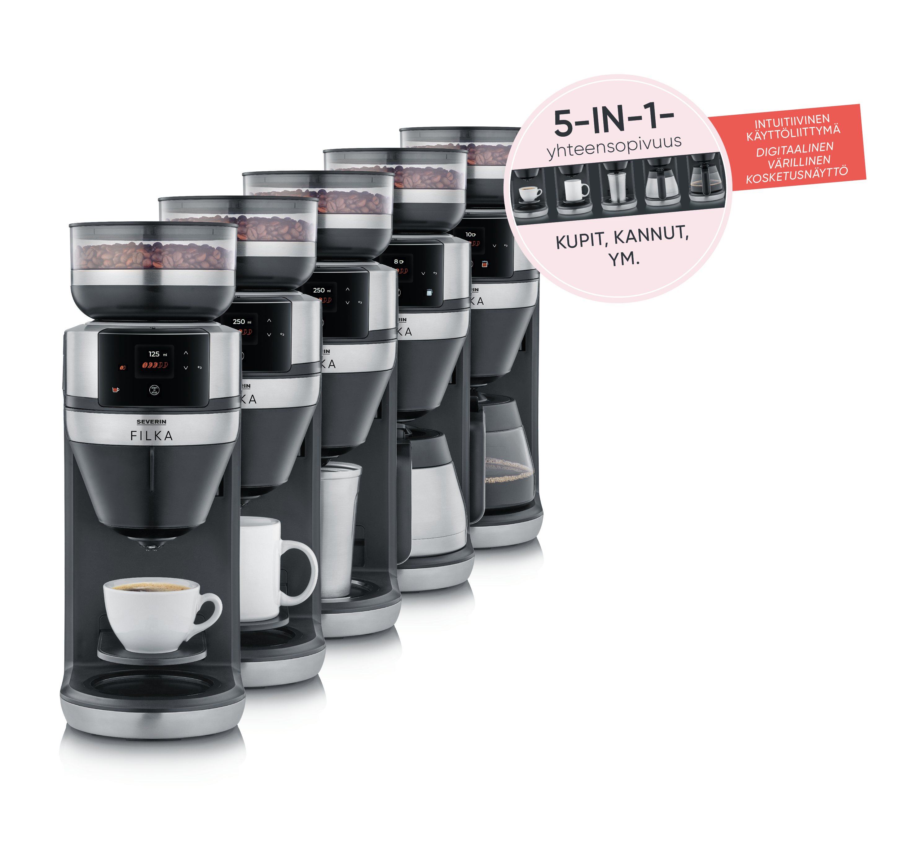 Käyttäjä voi valita pienten ja suurten kuppien sekä lasi- ja termoskannujen välillä.