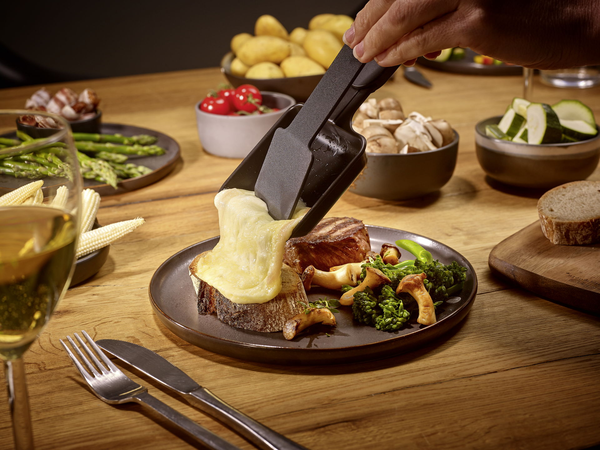 Kutsu ystäväsi viihtyisälle illalliselle, jonka päätähtenä on raclette. Anna makuhermojesi tanssia ilosta, kun täytät pienet raclettepannut henkilökohtaisilla suosikkiraaka-aineillasi ja nautit makujen ja aromien ihanasta yhdistelmästä. Samalla kun juusto sulaa ja gratinoi pannuissa, voit myös nauttia lihan paistamisesta keraamisella pinnoitetulla grillilevyllä. Tässä mallissa on käytännöllinen säilytystaso, johon voit helposti laittaa pannut, joita et juuri nyt käytä.